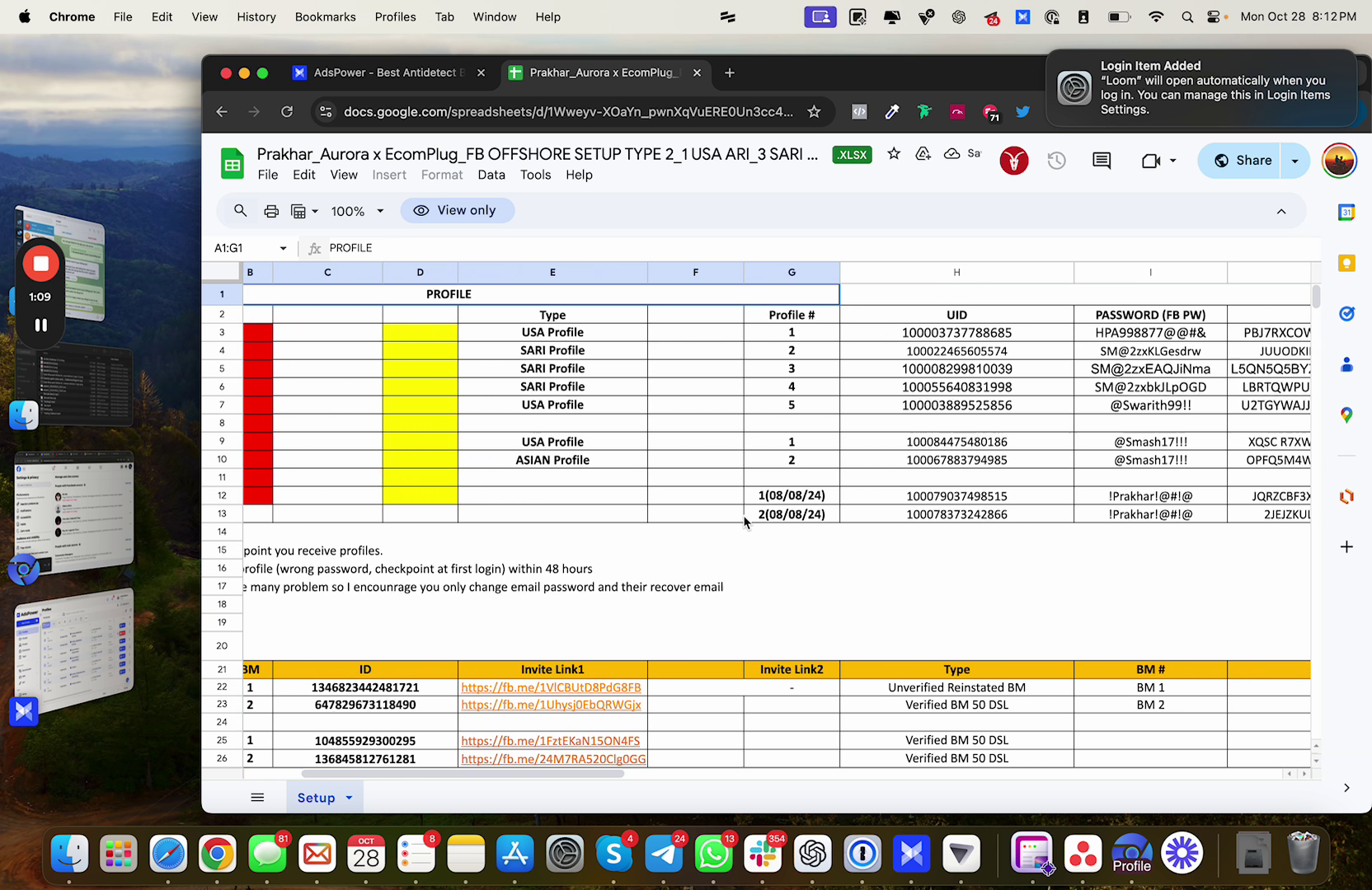 - The sheet includes essential information such as email addresses, passwords, and recovery options.