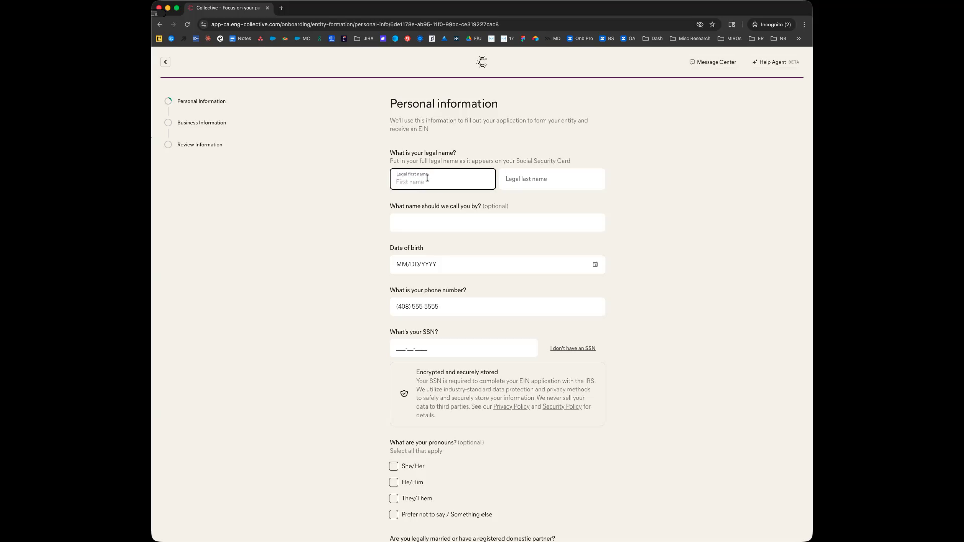 You will be prompted to enter your personal details, including your name, preferred name, birthday, and social security number. The platform ensures that your SSN is securely encrypted.