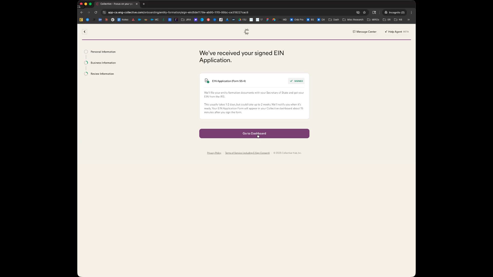 By following these steps, you have successfully set up your business and submitted the EIN application. All your business information has been verified, and your application is now pending processing. You can monitor the progress via the dashboard and await confirmation of your EIN.