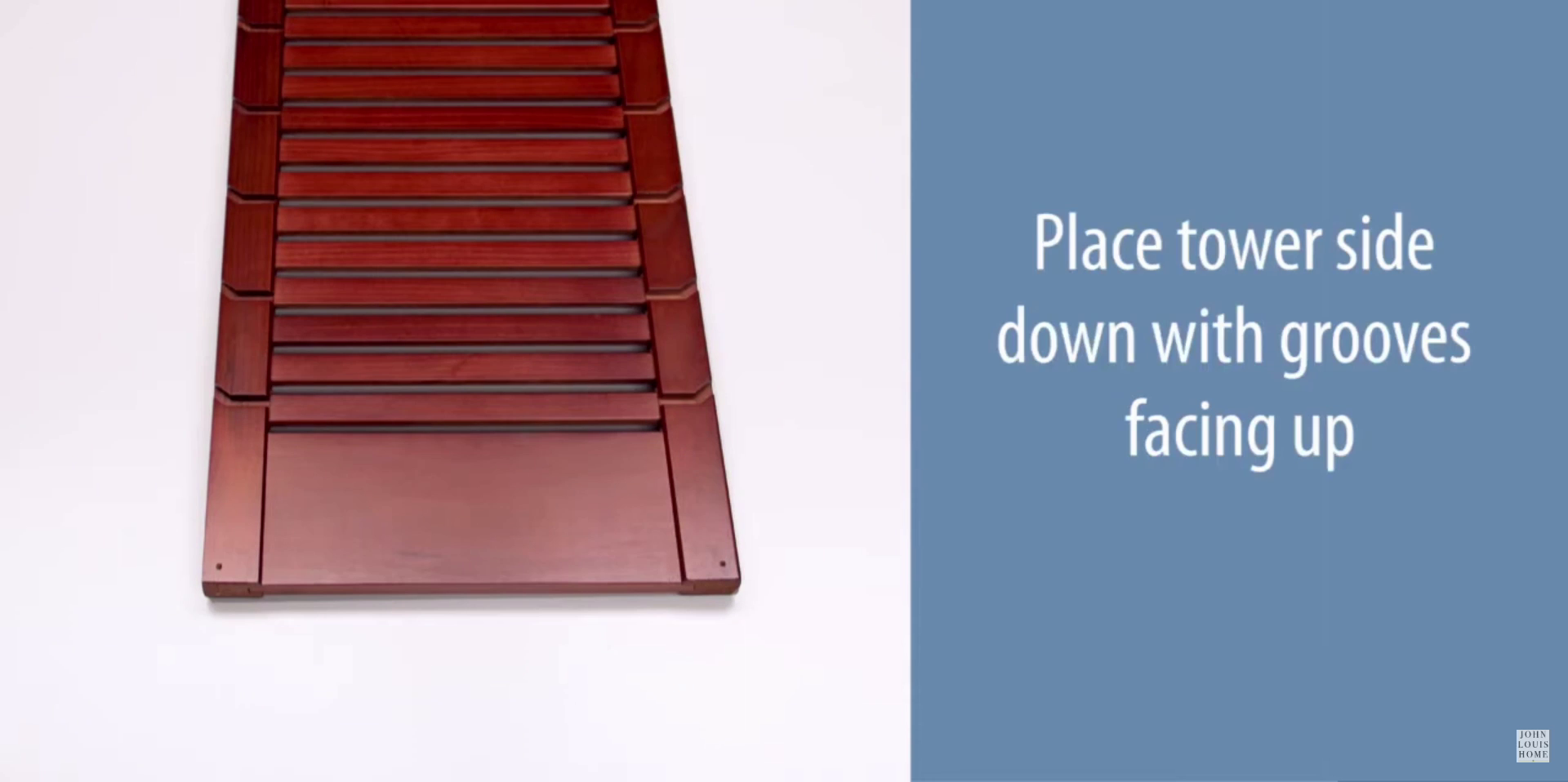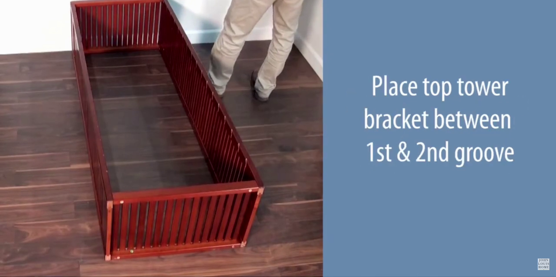 Place the tower side down with the grooves facing up. Secure a cam bolt to the tower side at the designated hole location. Repeat this process for the other location and for the second tower side.