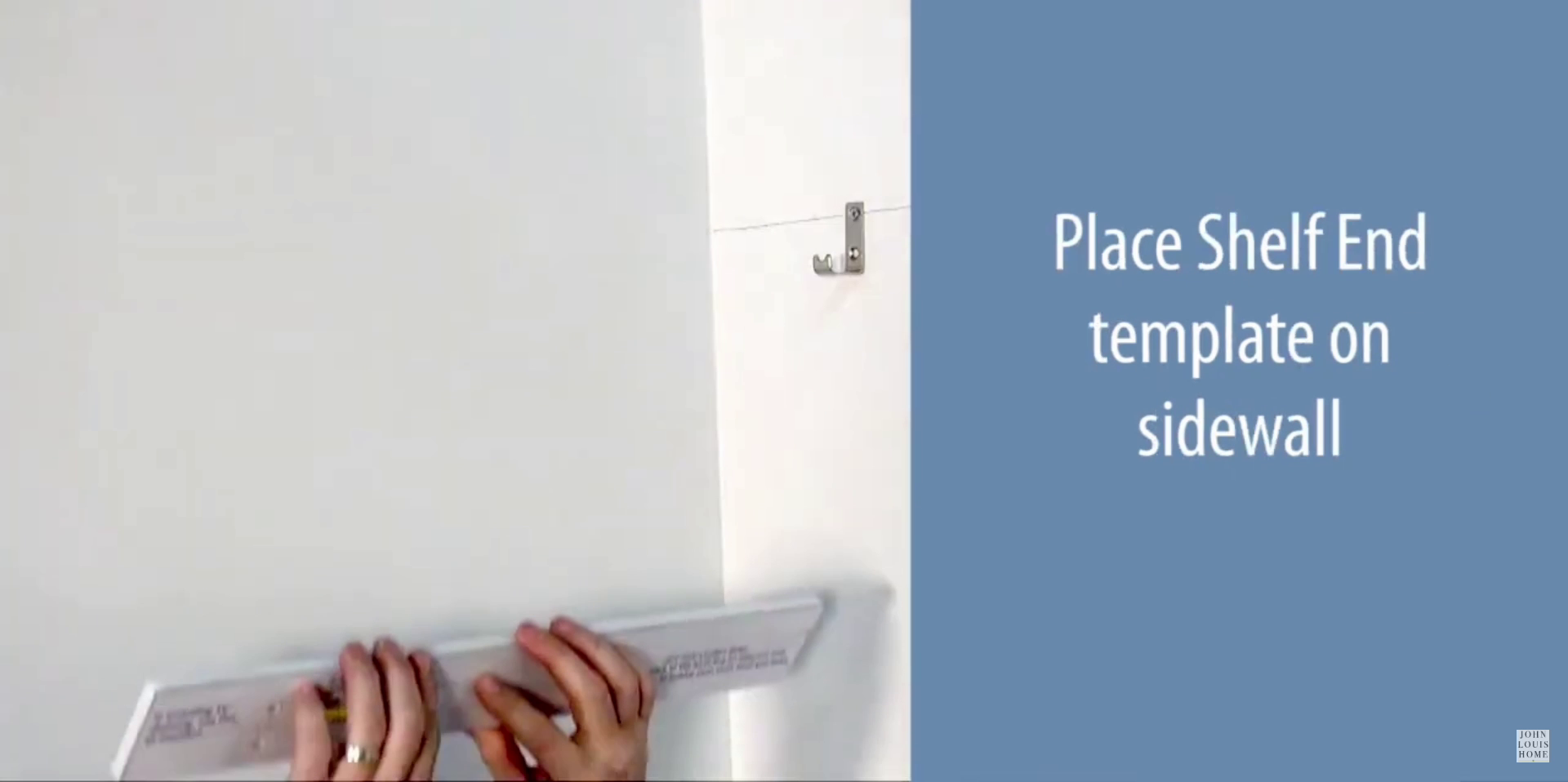 Place the shelf end template onto the side wall, aligning the template line with the wall line and leveling it. Mark the required shelf end position for the desired depth, either 12 or 16 inches, and secure using number 8 1 1/2 inch screws.