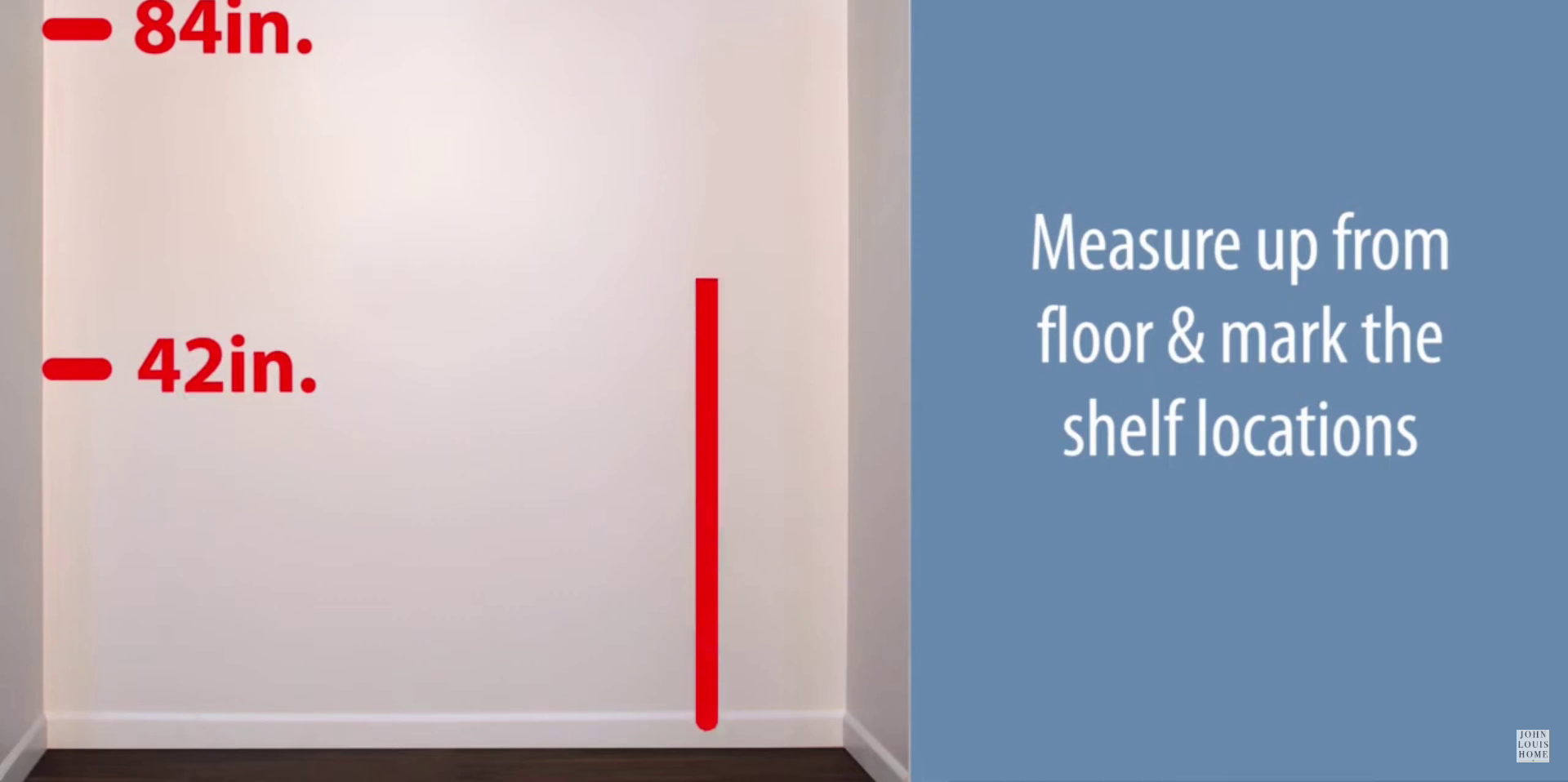 Next, locate the three initial weight locations for your configuration. Measure up from the floor and mark the shelf locations. Draw a six-foot level line out from the wall-end at the 84-inch location, followed by a four-foot level line out from the wall-end at the 42-inch location.