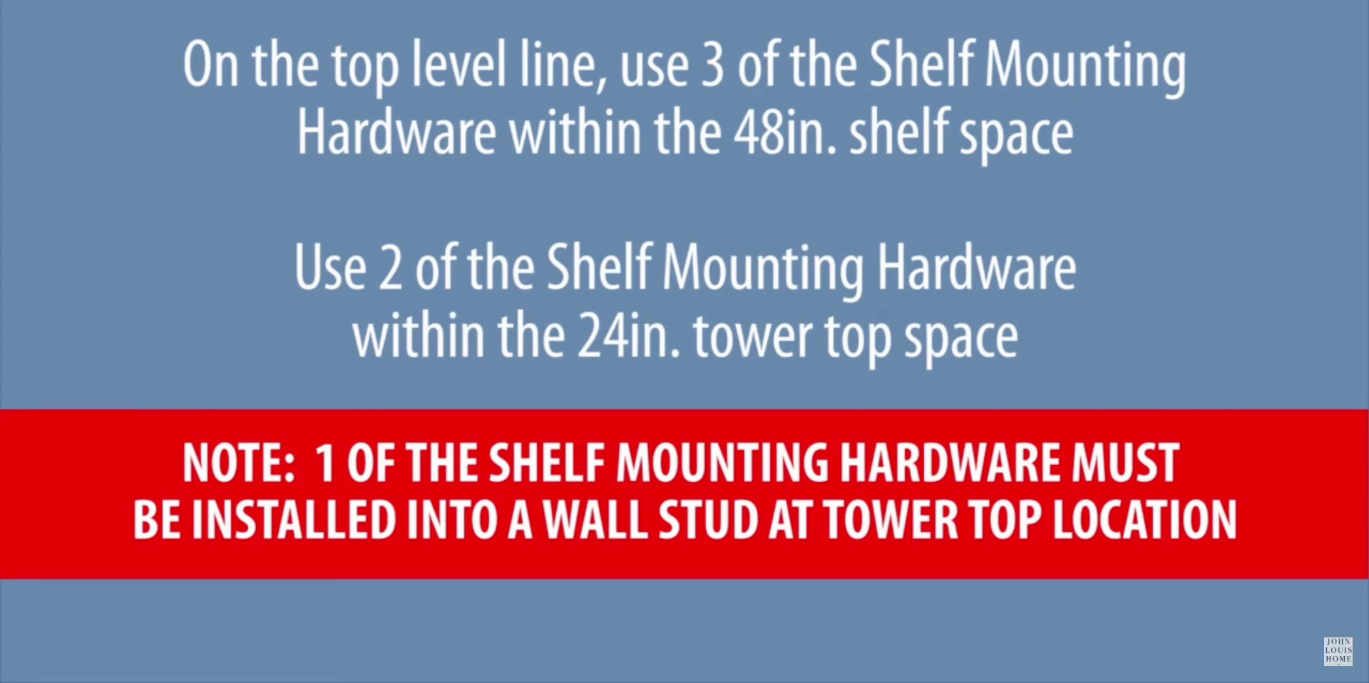 On the top level line, use three of the shelf mounting hardware within the 48-inch shelf space. Also, use two of the shelf mounting hardware within the 24-inch tower top space. Ensure that one of the shelf mounting hardware is installed into a wall stud at the tower top location.