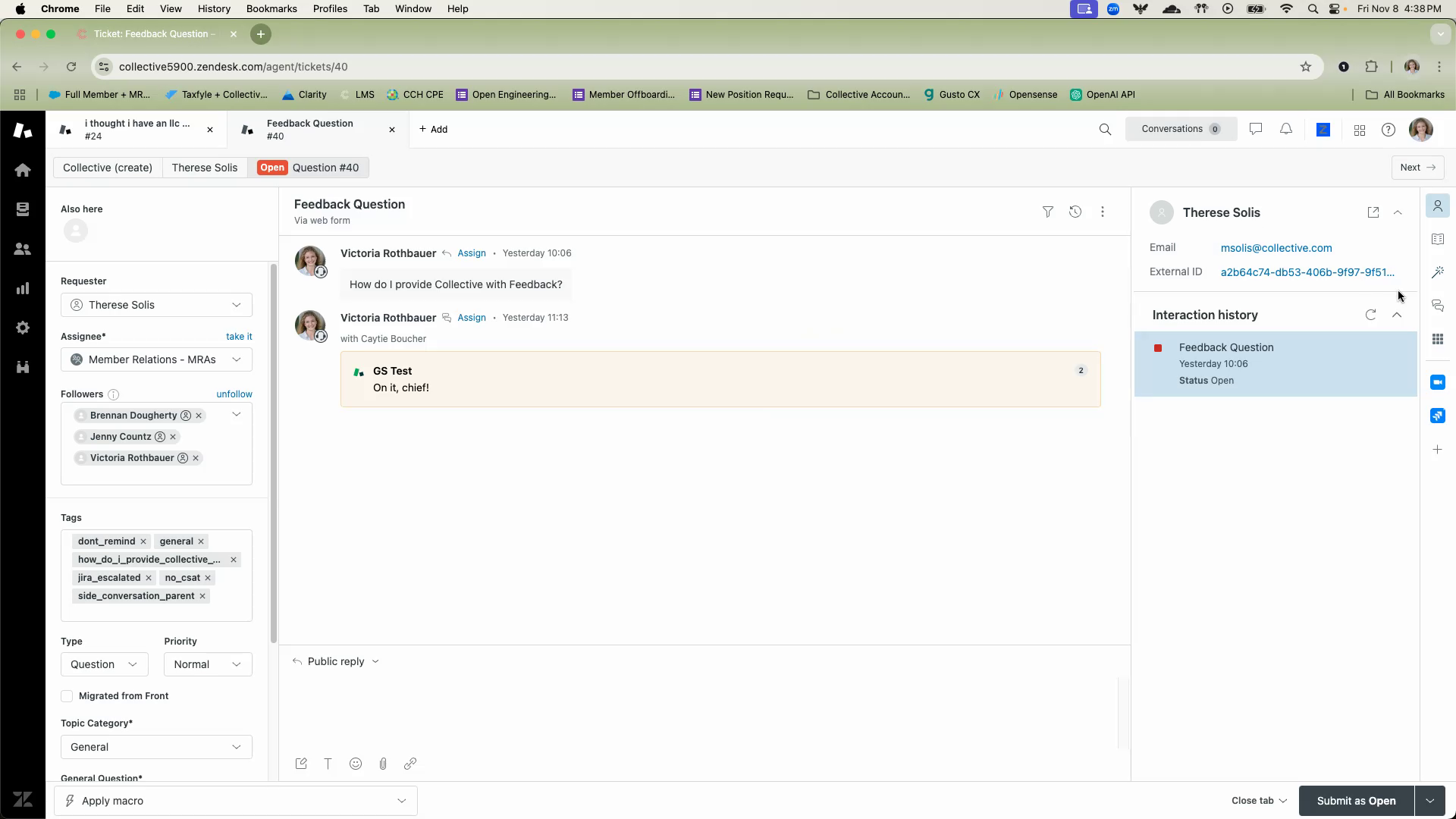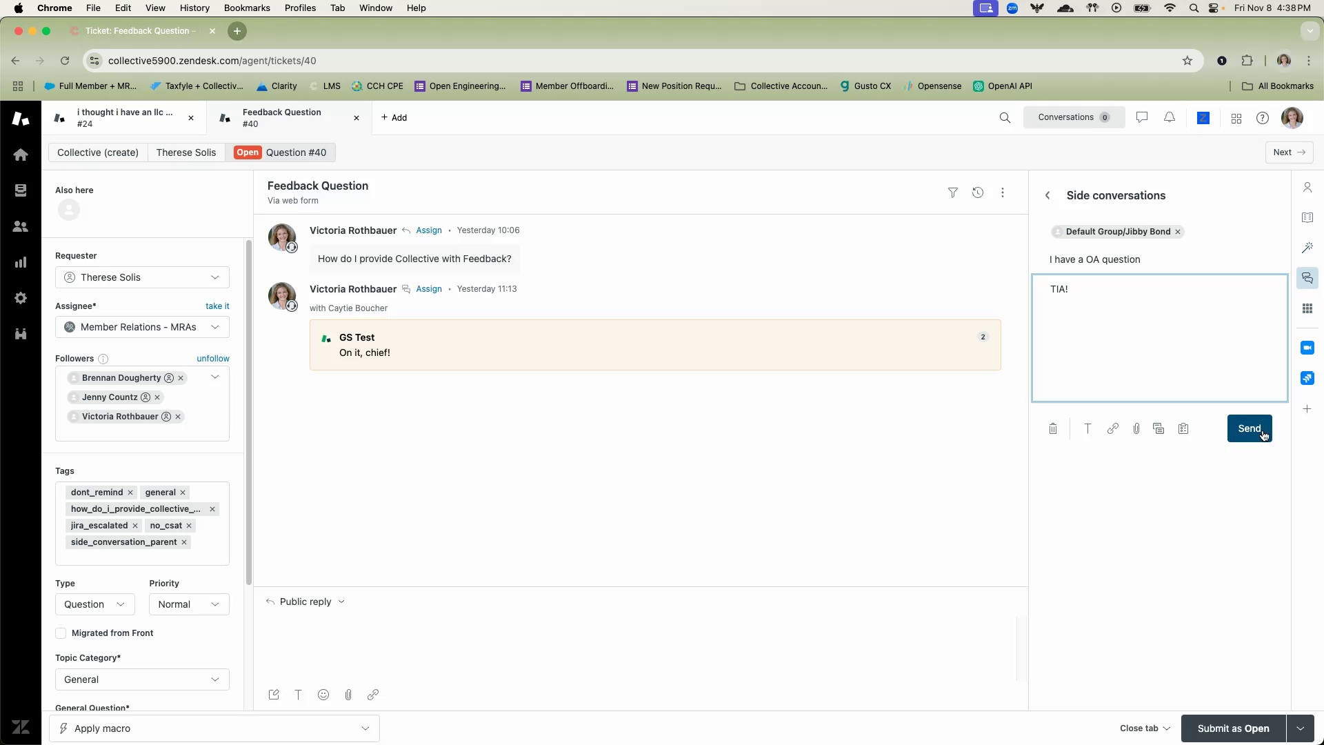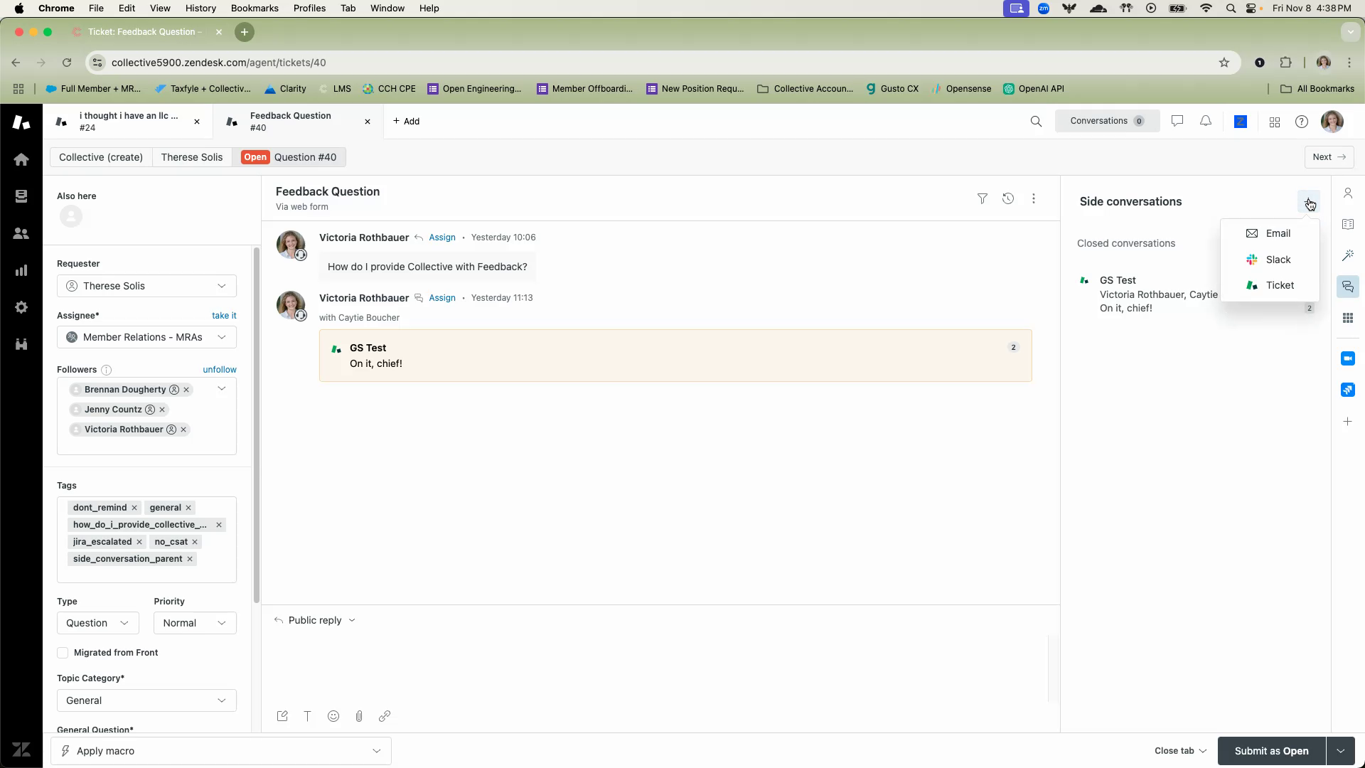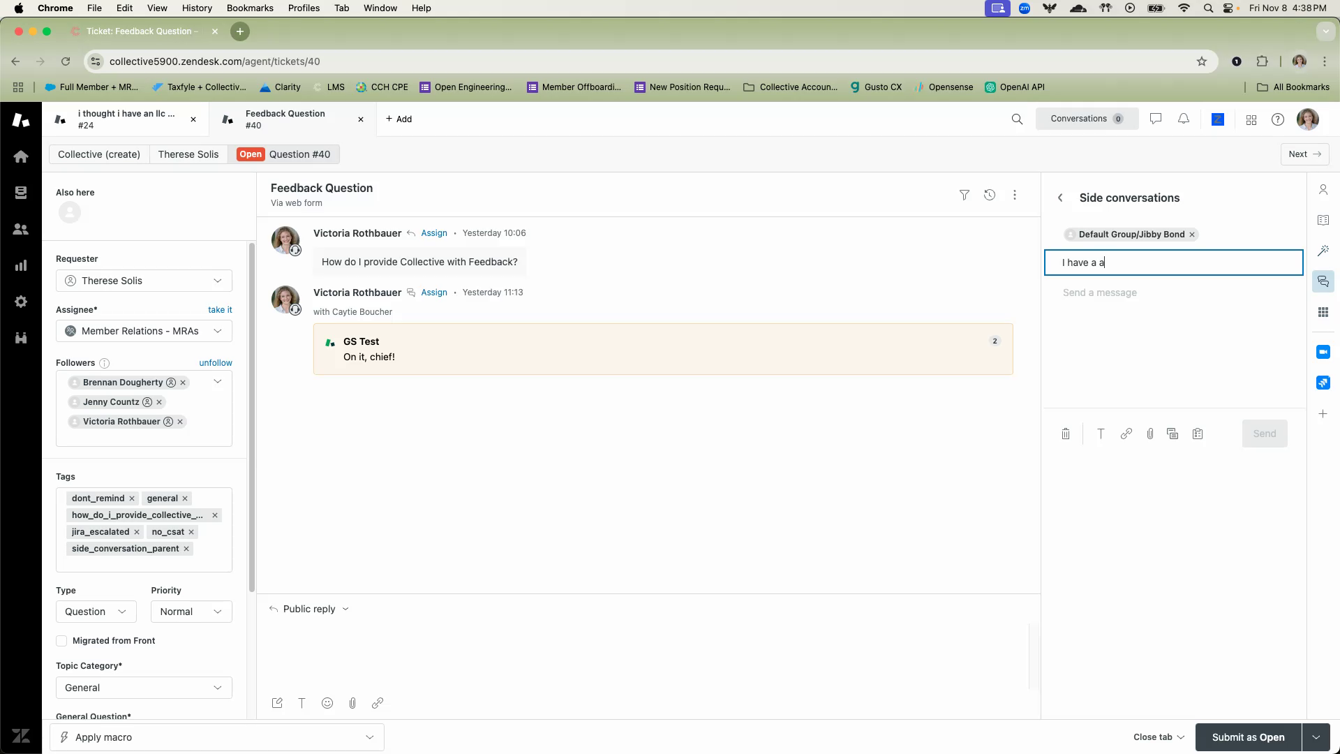 You will see that the side conversation appears in your ticket view. Note that it is not sent to the member but is visible to you.