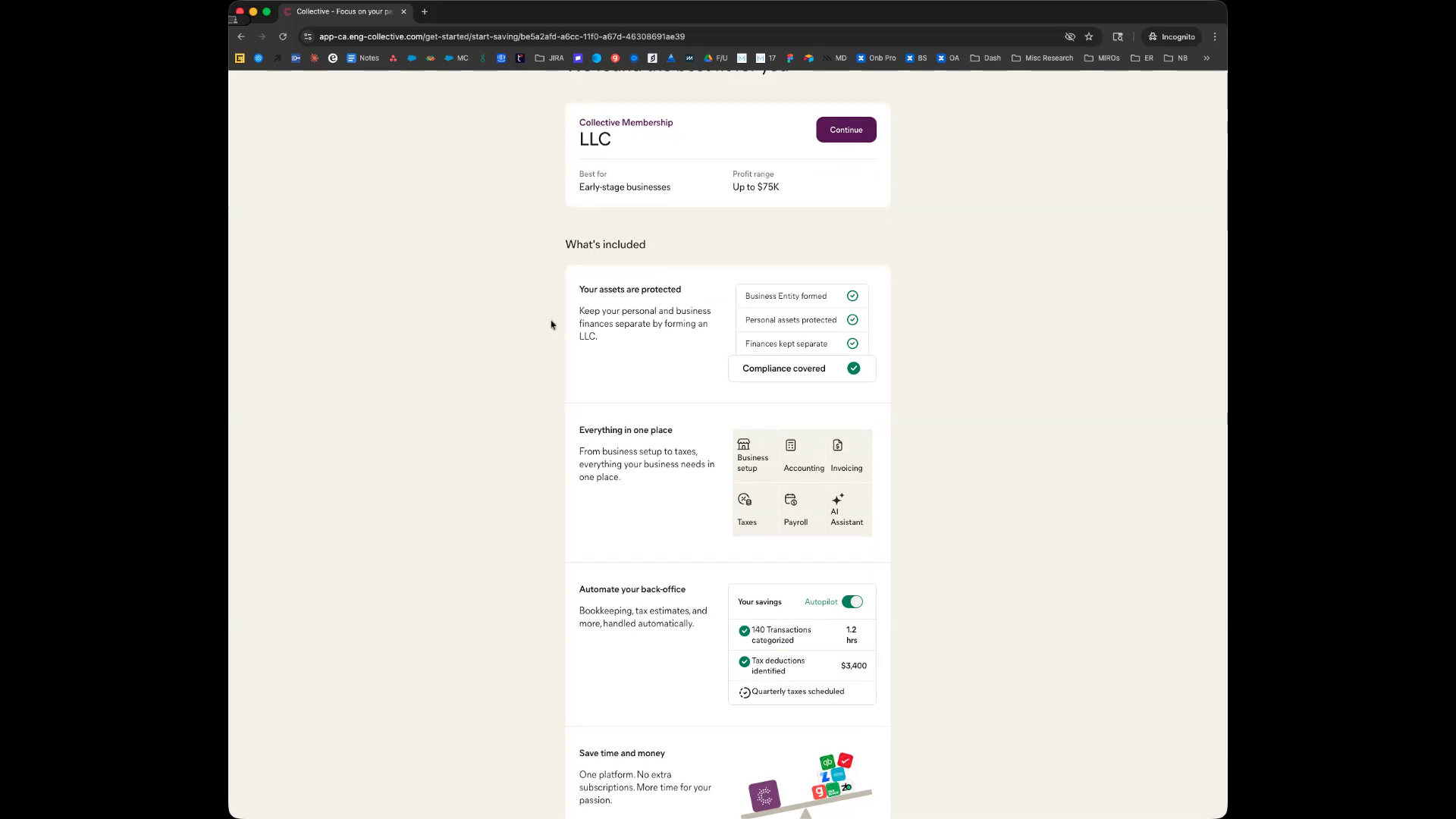 Based on your inputs, the platform will suggest a suitable membership plan. For early-stage businesses, the Collective LLC membership is recommended.