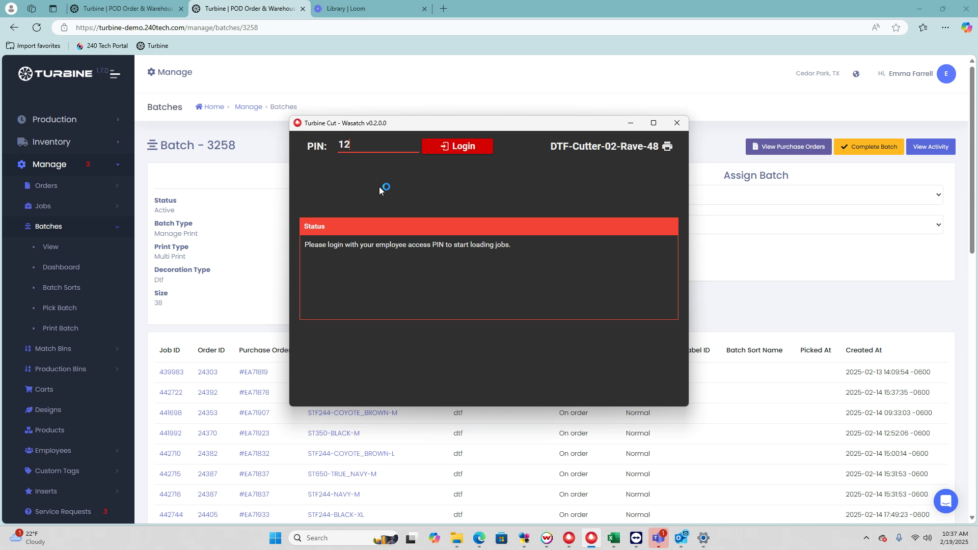 Start by opening the Turbine Cut app. Log in using your employee pin and click on "Load" to begin. This step prepares the app to receive cut files.