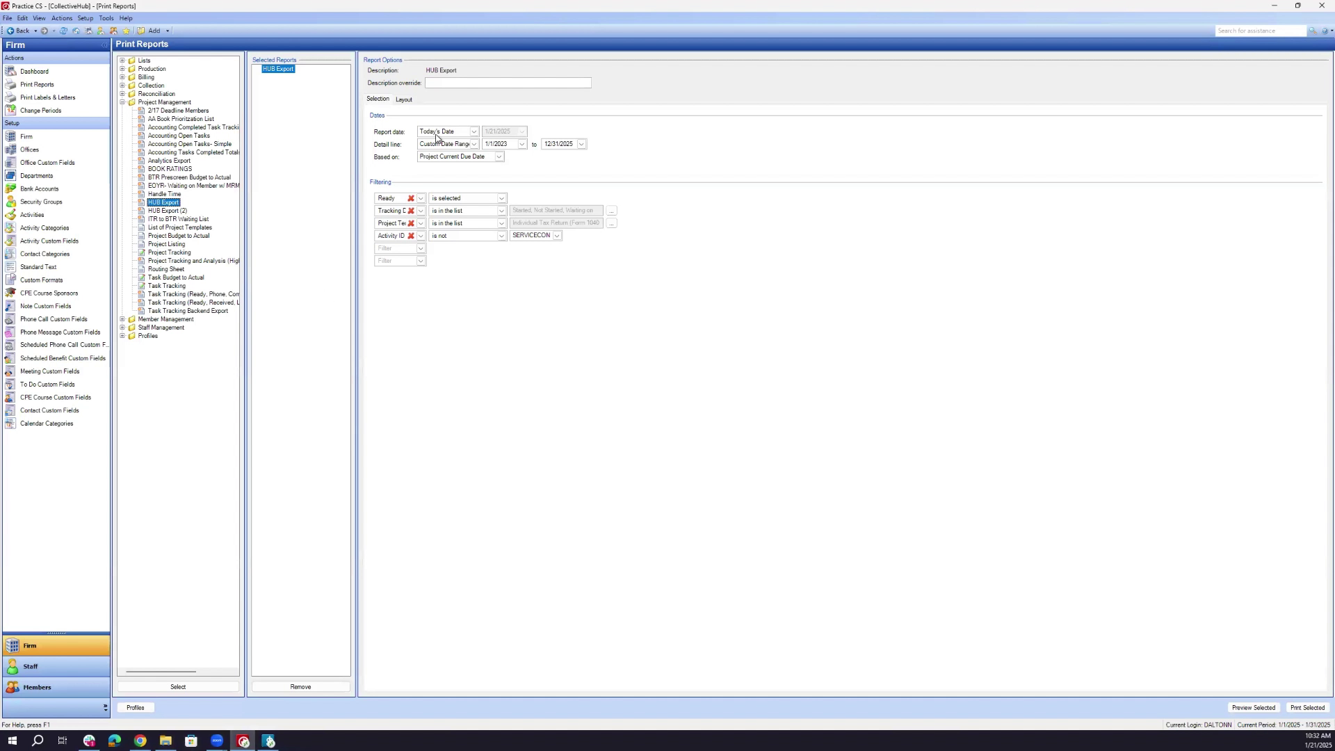 - Select the hub export report, set the date range, and apply the necessary filters.