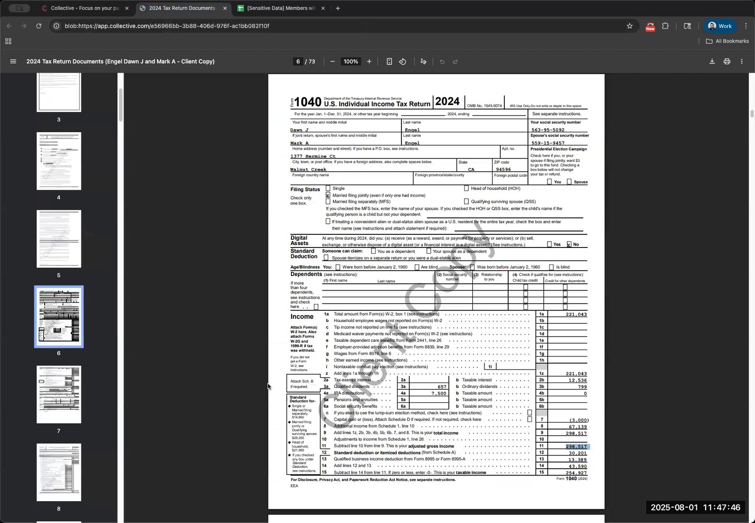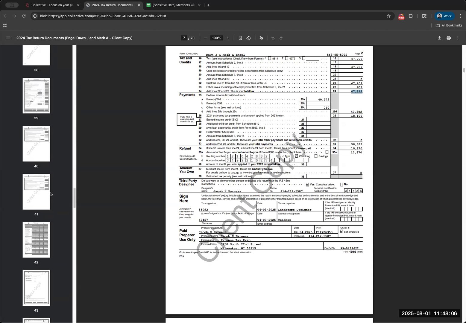 Locate and view the 2024 tax return, specifically page two of the 1040 form. Extract key figures such as AGI (line 11) and total tax liability (line 24). If applicable, also extract state AGI and total tax from the state section.