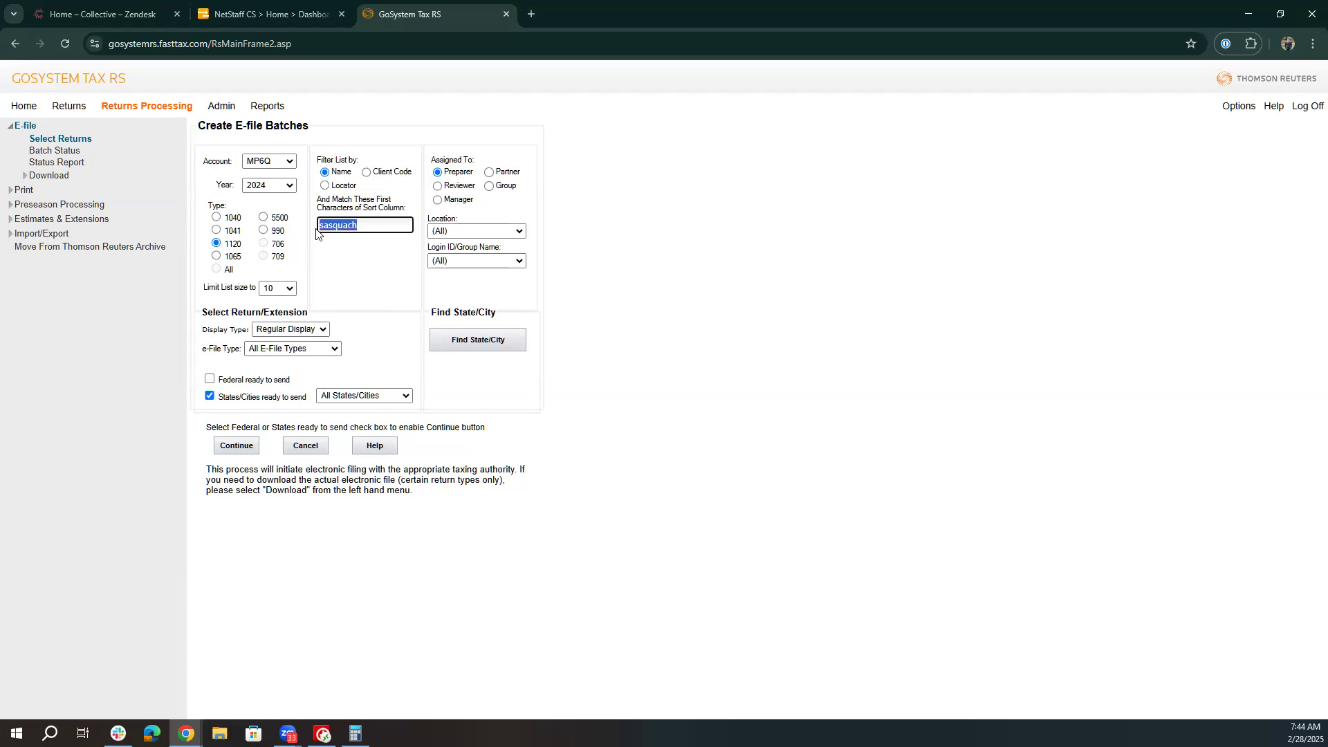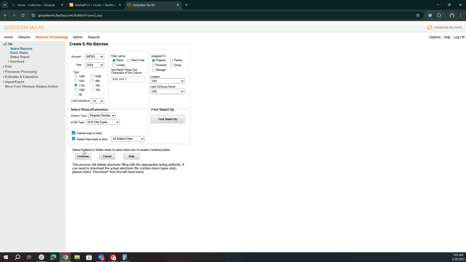 Choose whether to send federal, state, or both types of returns. Proceed by clicking continue.