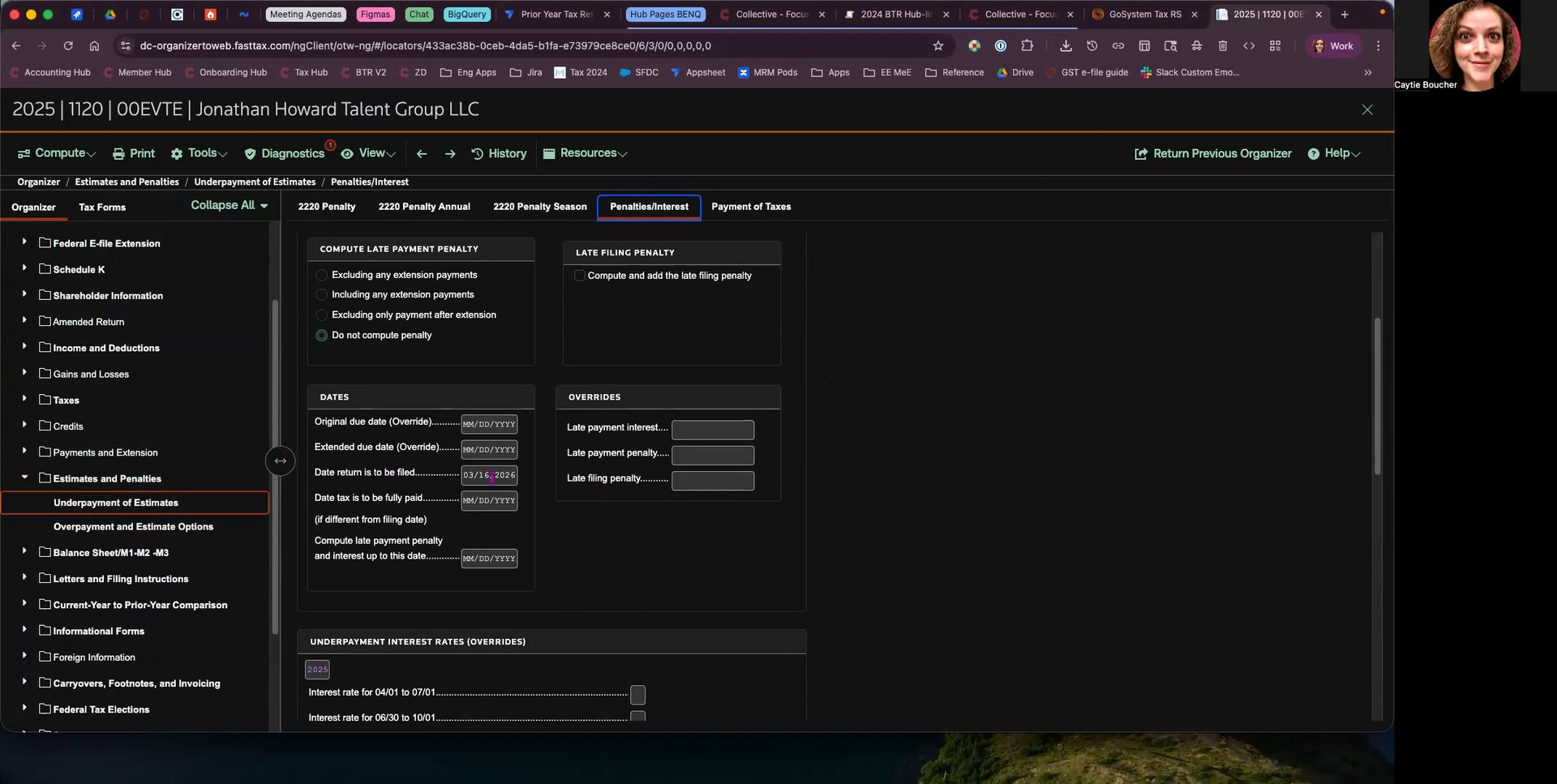 To report the date the federal return is to be filed, navigate to the organizer view. Go to the section labeled "Estimates and Penalties" under "Underpayment of Estimates, Penalties, and Interest".