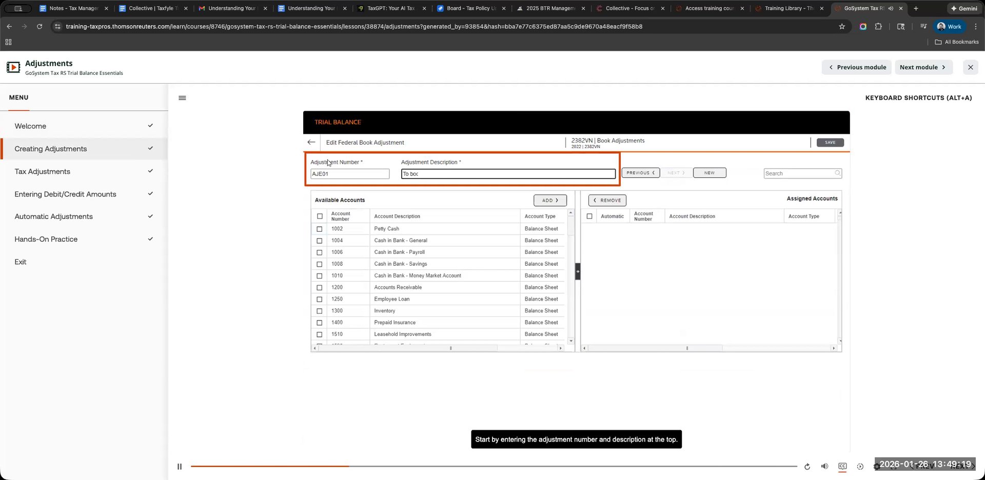 Start by entering the adjustment number and a brief description at the top of the screen.