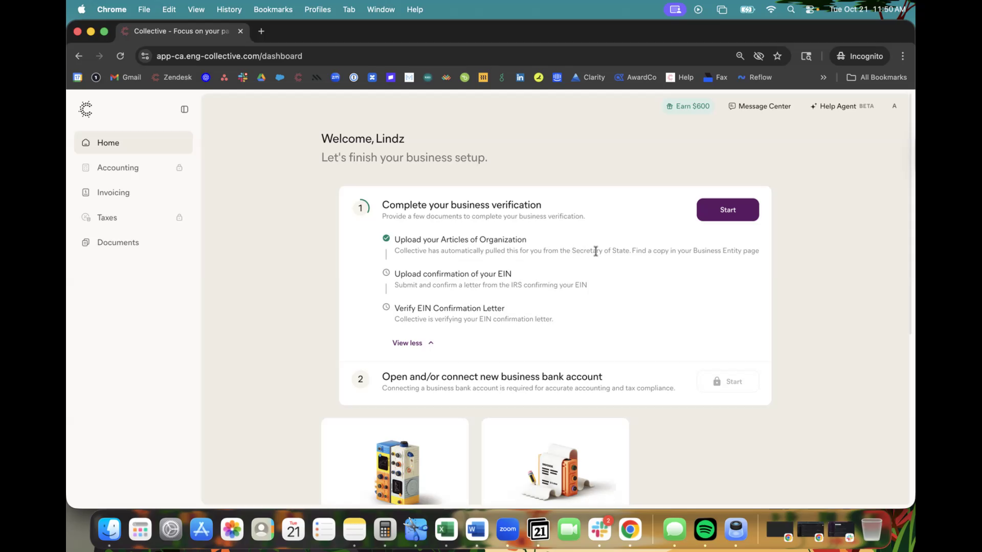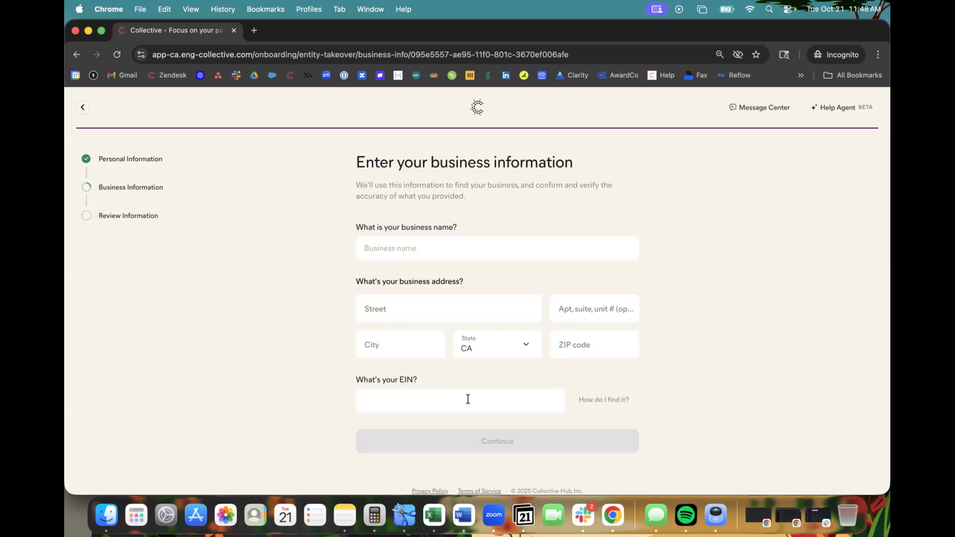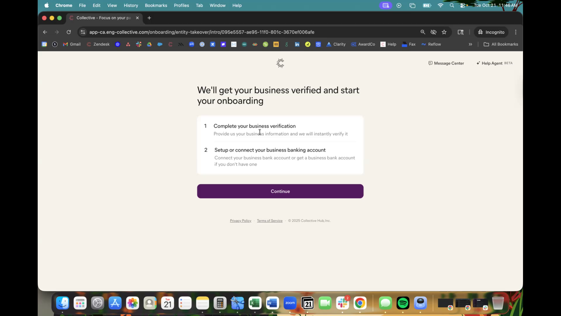 By following these steps, you have successfully set up your business with Collective. This guide has walked you through entering and verifying personal and business information, ensuring a smooth onboarding process. Your business is now set up and ready to move forward with Collective.