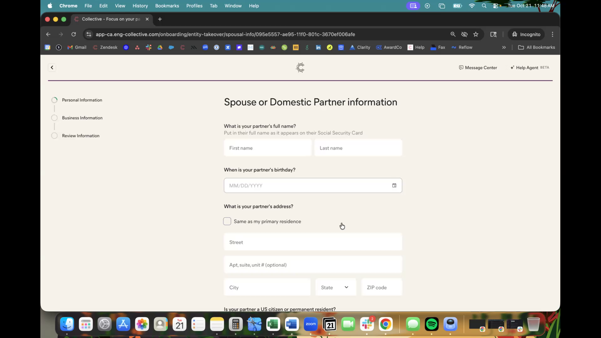 If applicable, provide information about your spouse or domestic partner, including their full name, birthday, address, citizenship status, and social security number.
