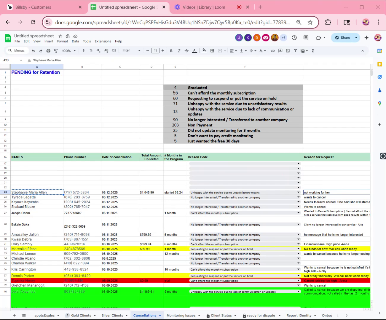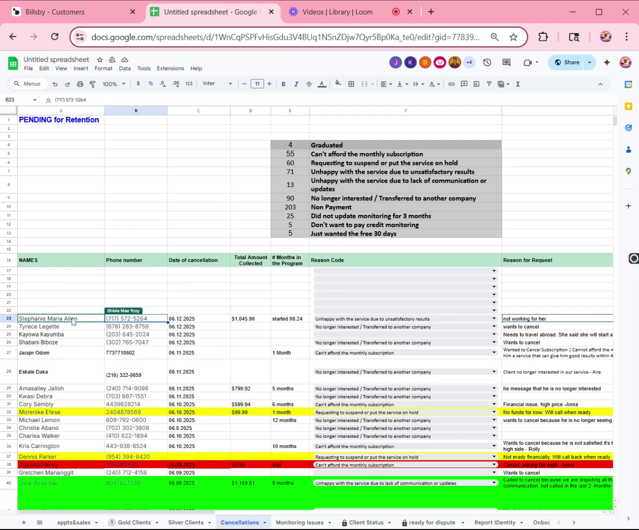 - Add the client's information in the cancellation tab, including their name, phone number, date of cancellation, total amount collected, number of months in the program, and reason for cancellation.