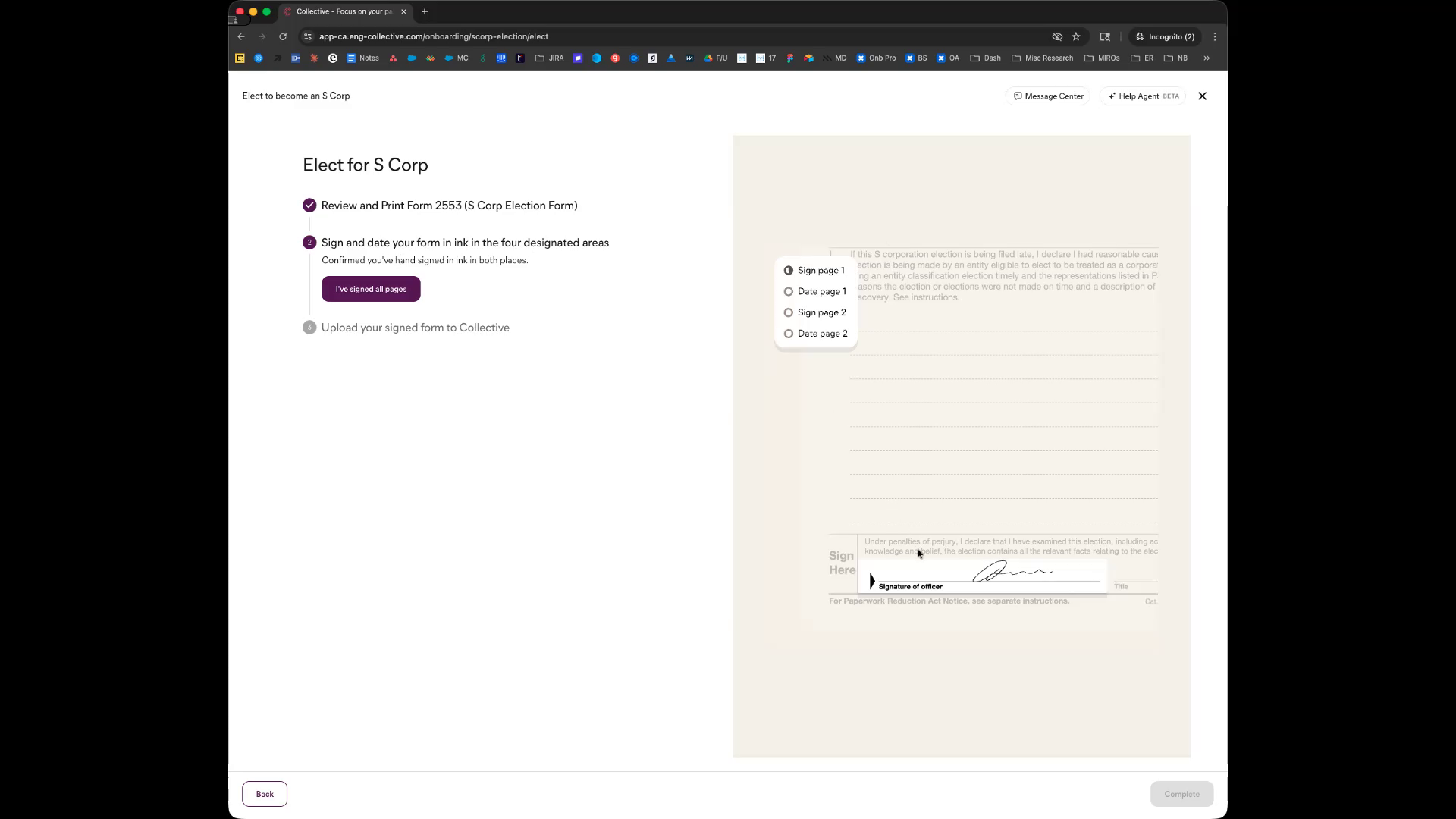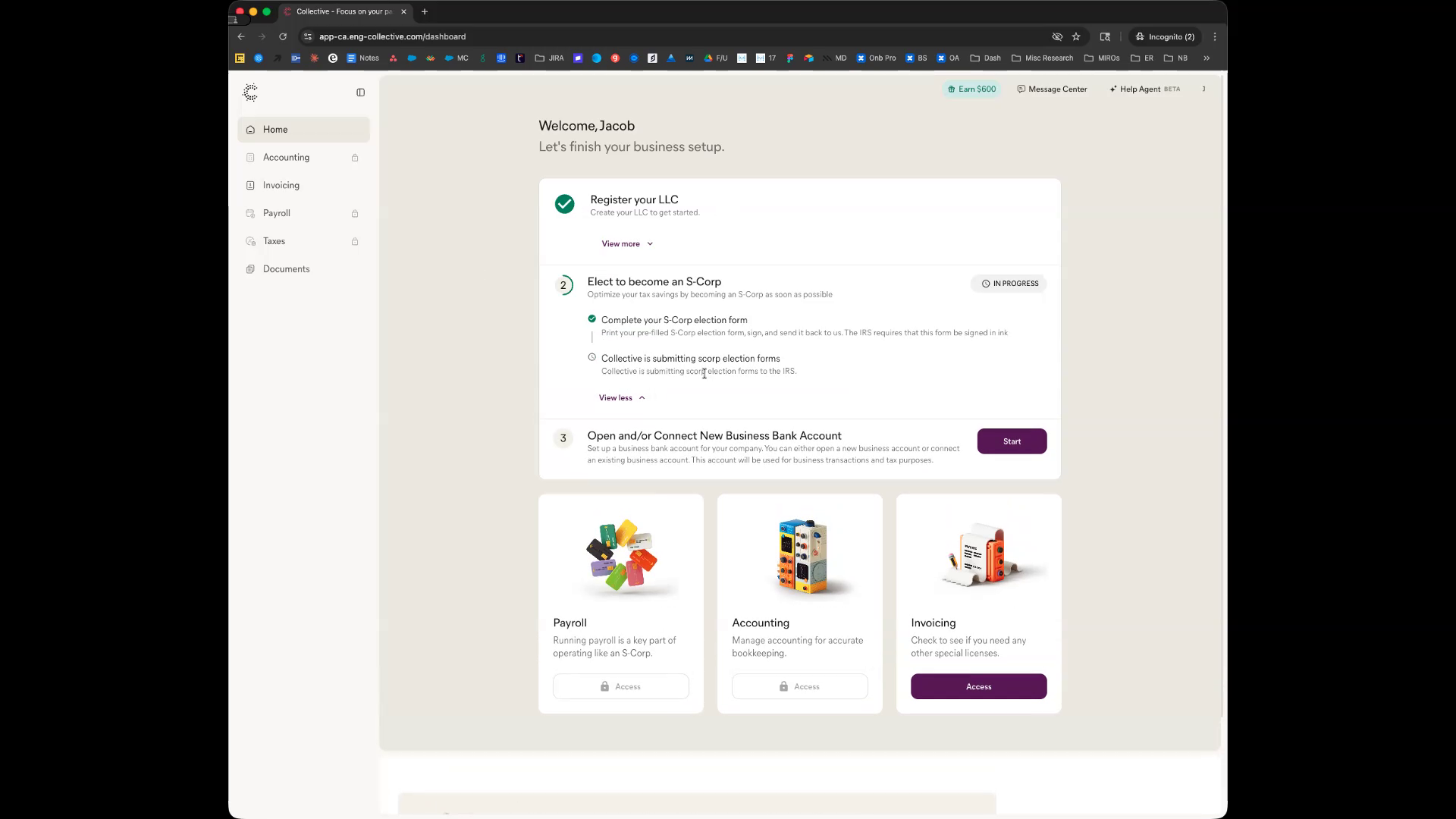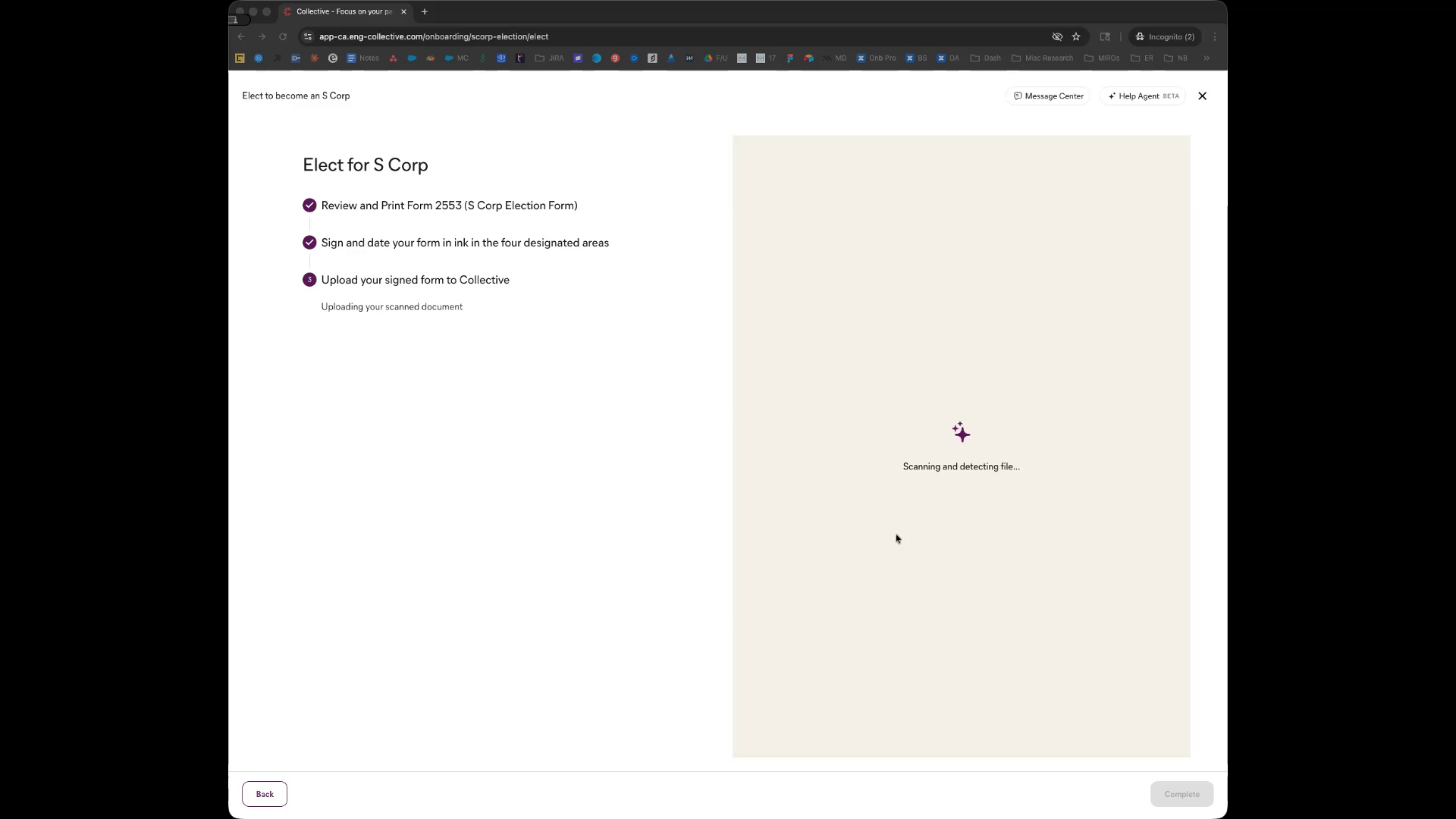 This guide will walk you through the process of electing S-Corporation status for your newly formed LLC using the Collective platform. By following these instructions, you'll learn how to access necessary documents, complete and sign the S-Corp election form (Form 2553), and upload it for submission.