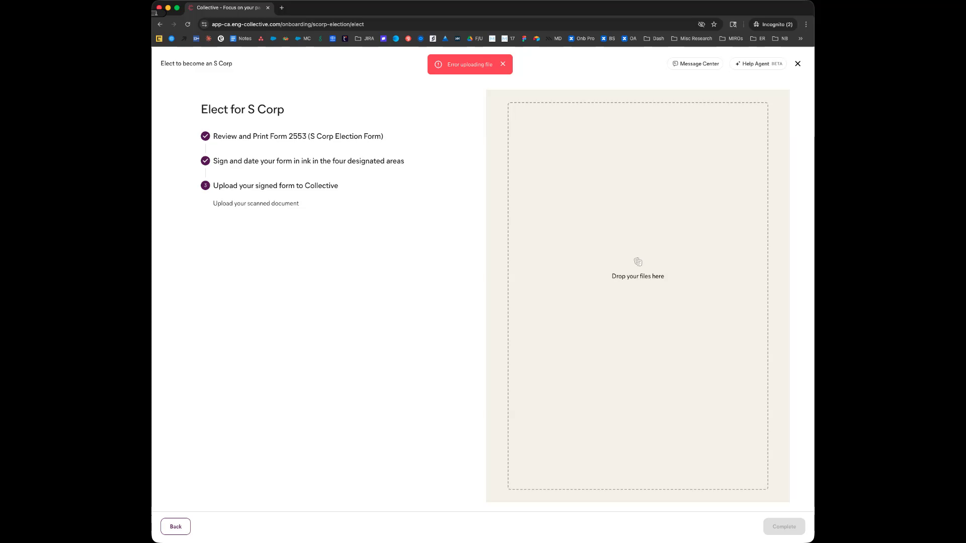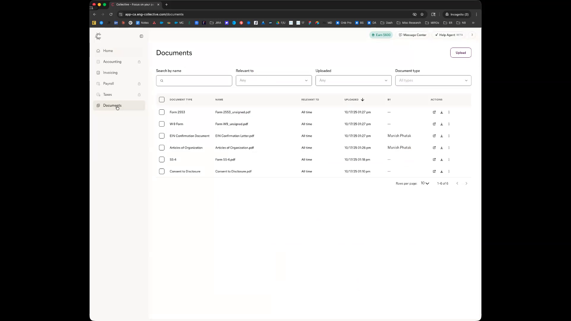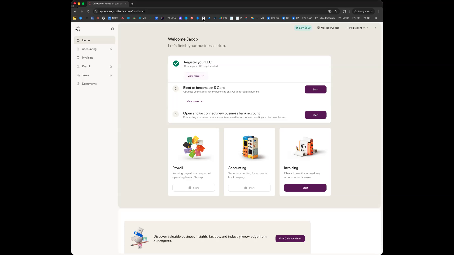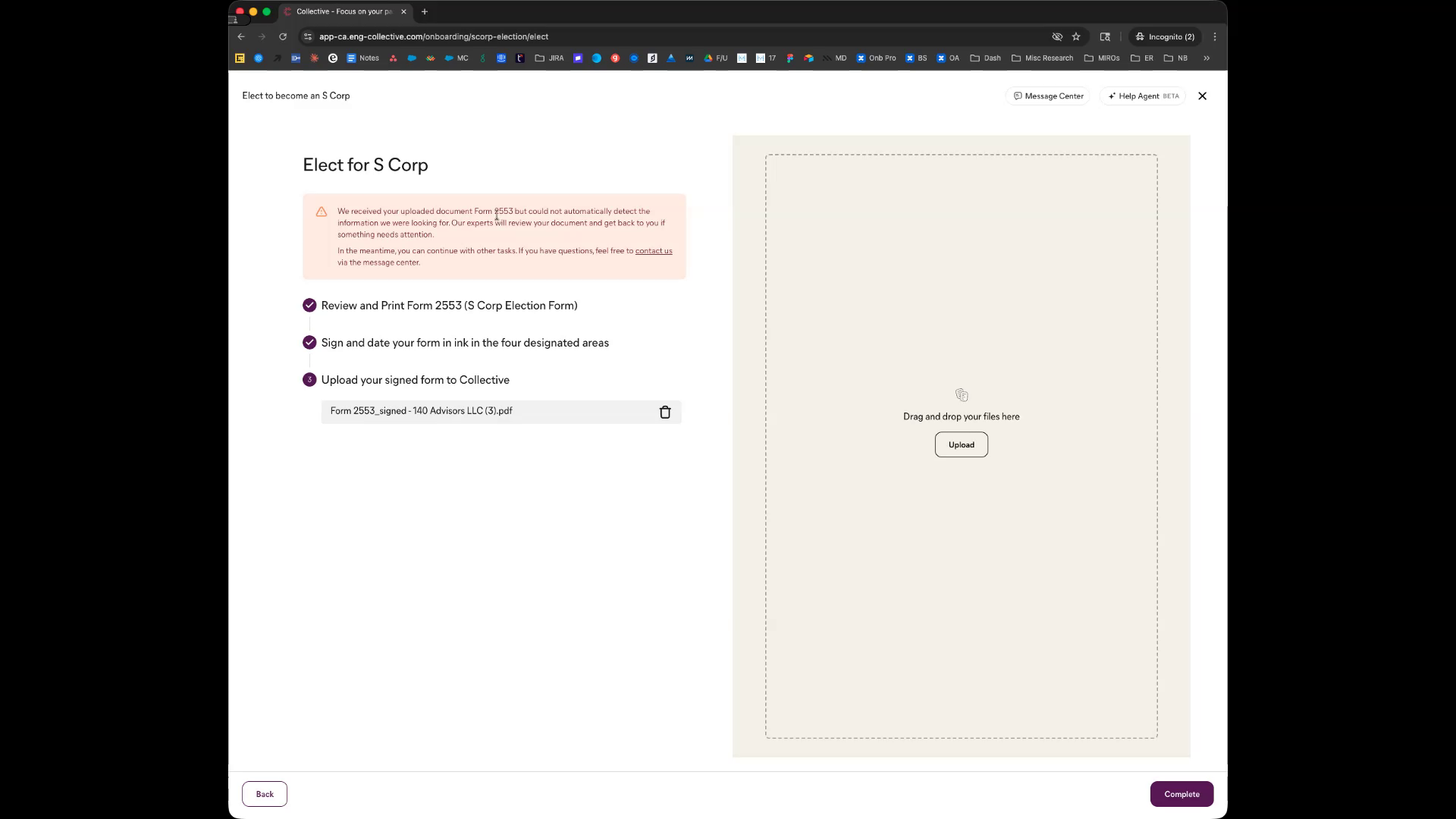 This guide will walk you through the process of electing S-Corporation status for your newly formed LLC using the Collective platform. By following these instructions, you'll learn how to access necessary documents, complete and sign the S-Corp election form (Form 2553), and upload it for submission.