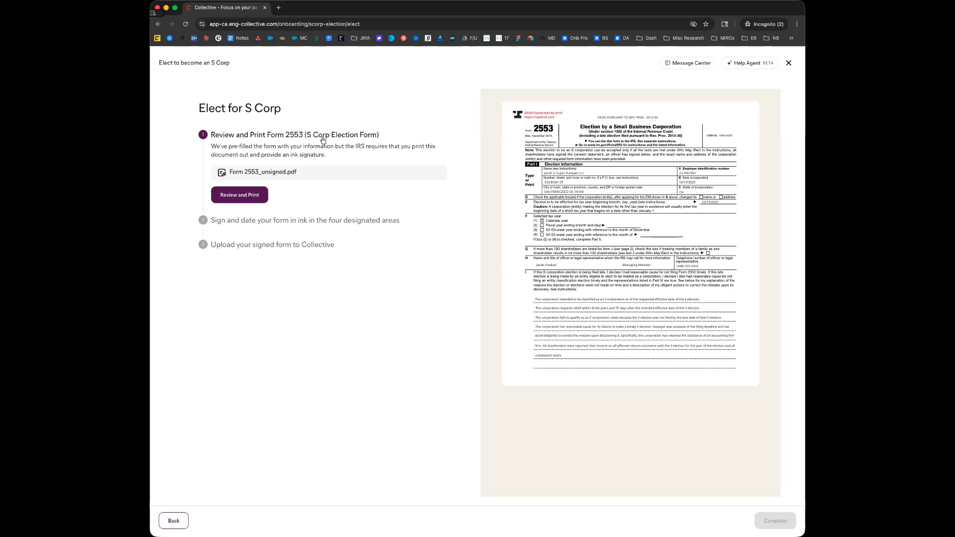 Collective pre-fills Form 2553, but the IRS requires a printed copy with an ink signature. Review the form, print it, and sign with a pen.