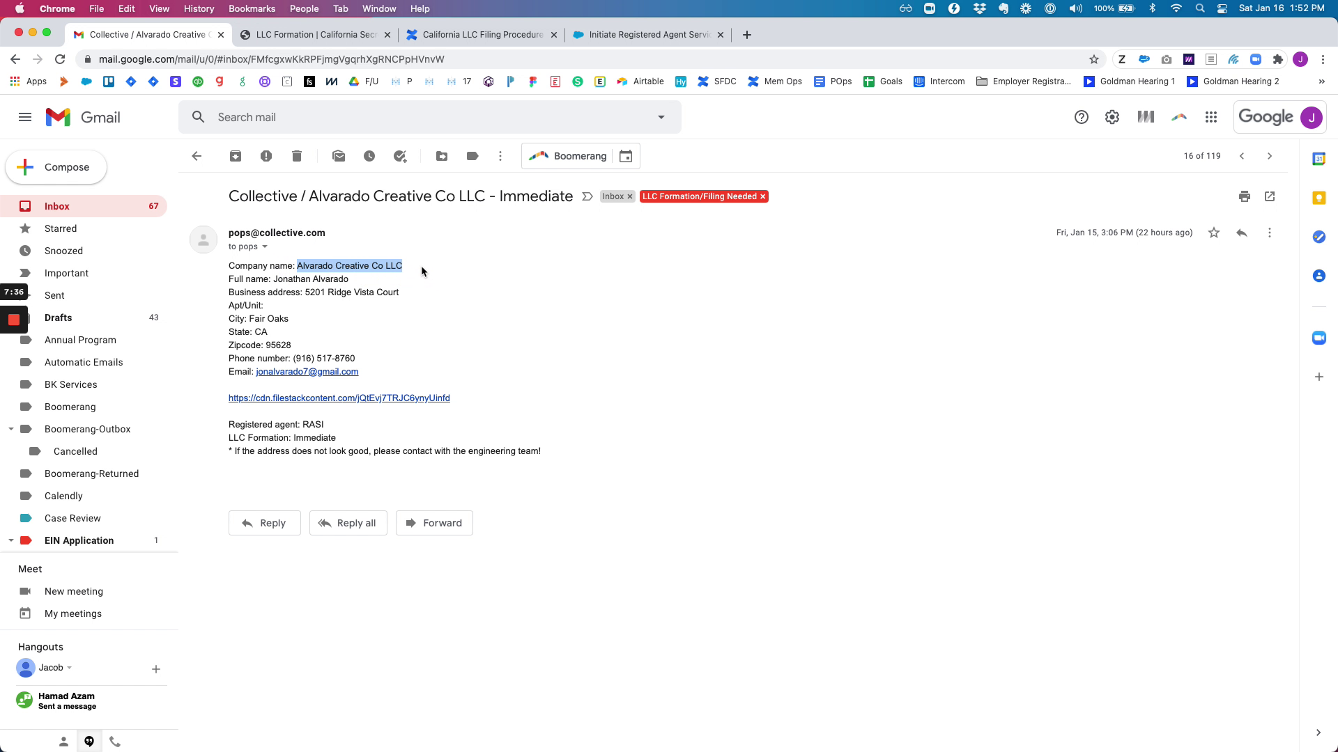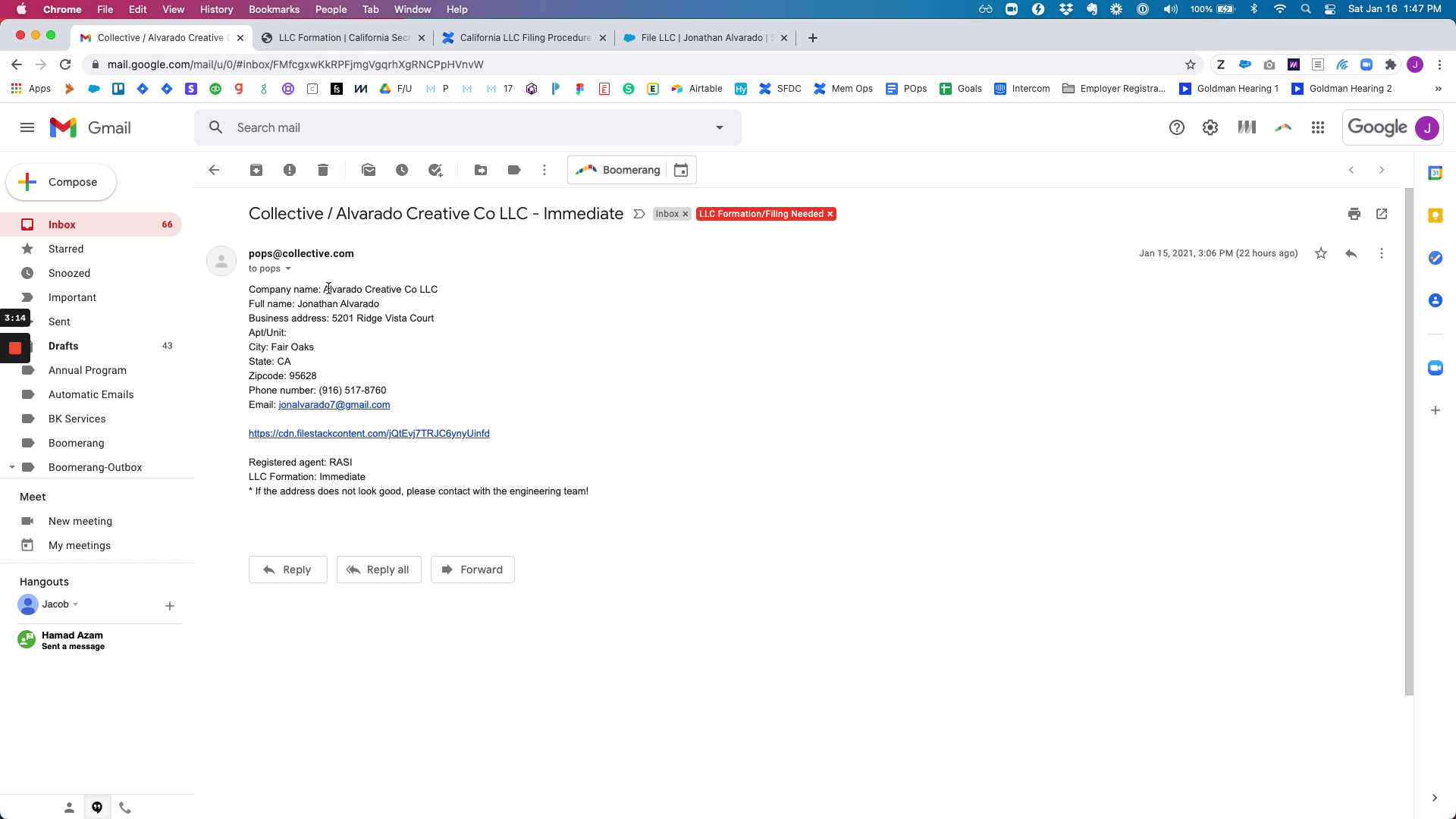 The process begins with receiving an auto-generated email from the engineering team. This email contains essential information for filing the LLC, such as the company name, full name of the person, address, city, state, zip code, phone number, and email. It also indicates the registered agent and whether the filing should be immediate.