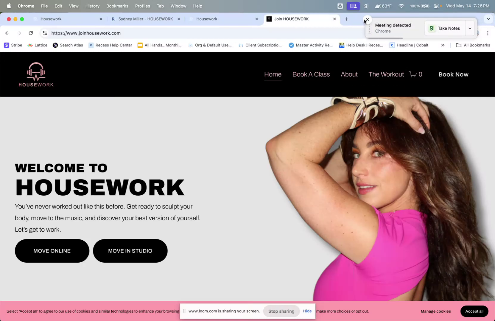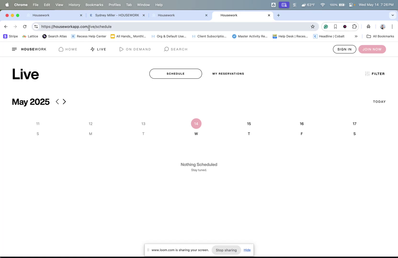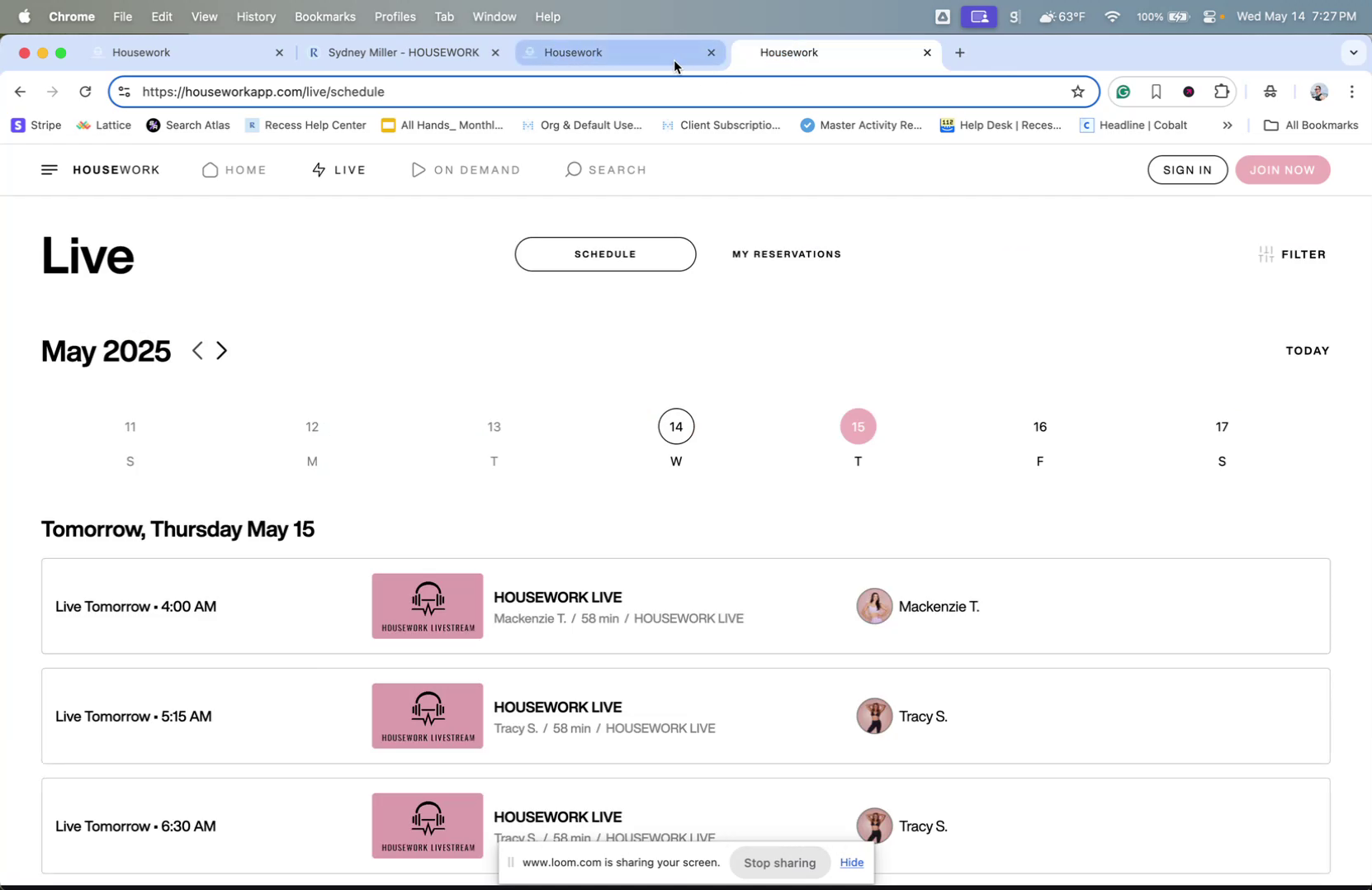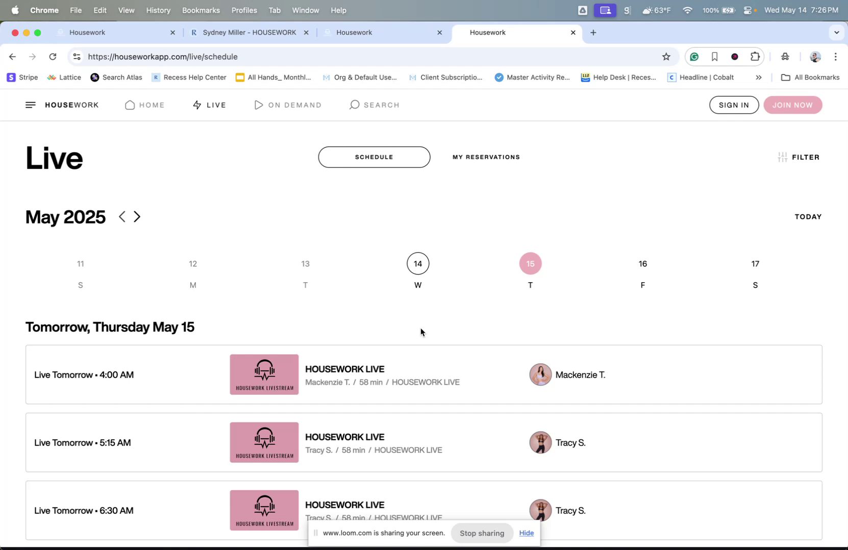 Upon clicking the "Reserve" button, you will be redirected to a different website, houseworkapp.com/live. This site hosts the available classes for booking.