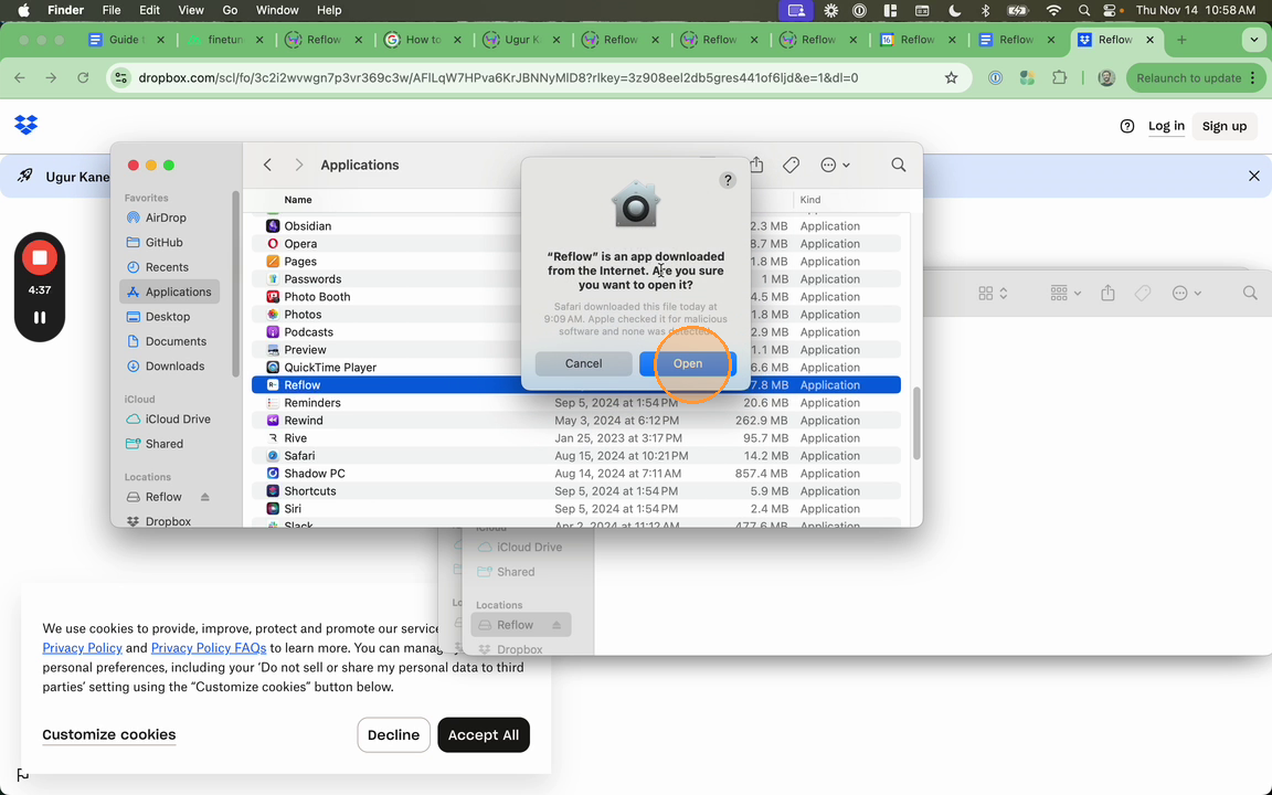 After moving the application, navigate to your Applications folder, find Reflow, and double-click on it. A prompt will appear asking if you are sure you want to open it. Click "Open" to launch the application for the first time.