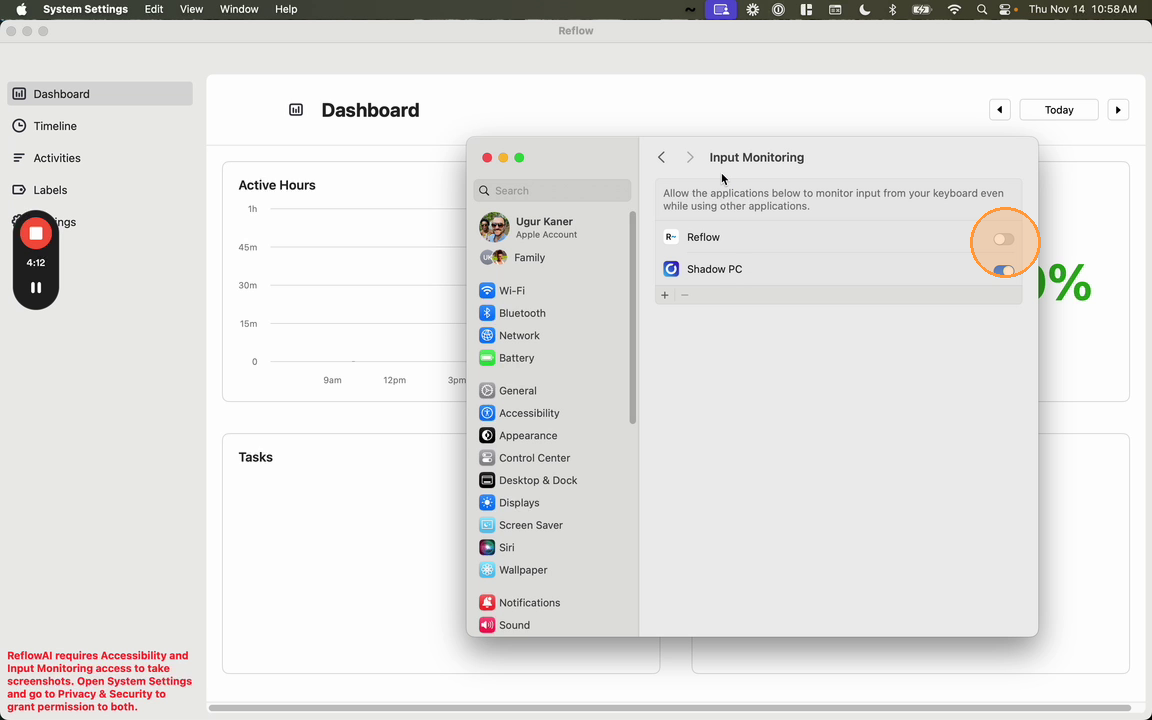 In System Settings, navigate to Input Monitoring. Here, you need to enable Reflow by clicking on the corresponding button.