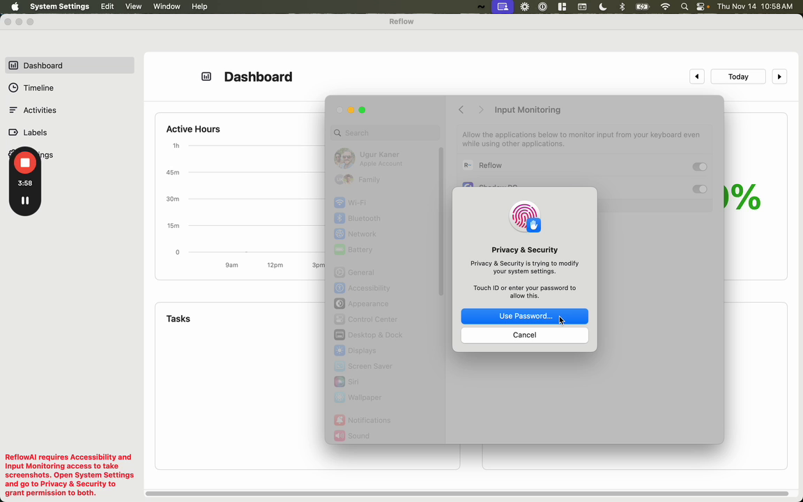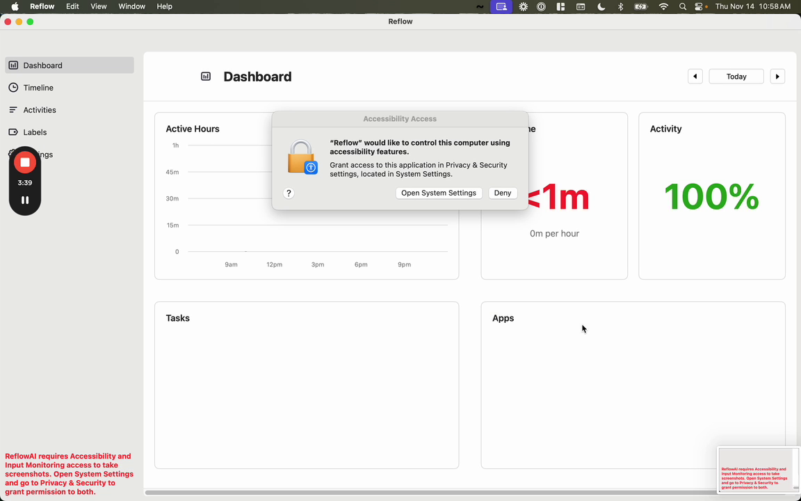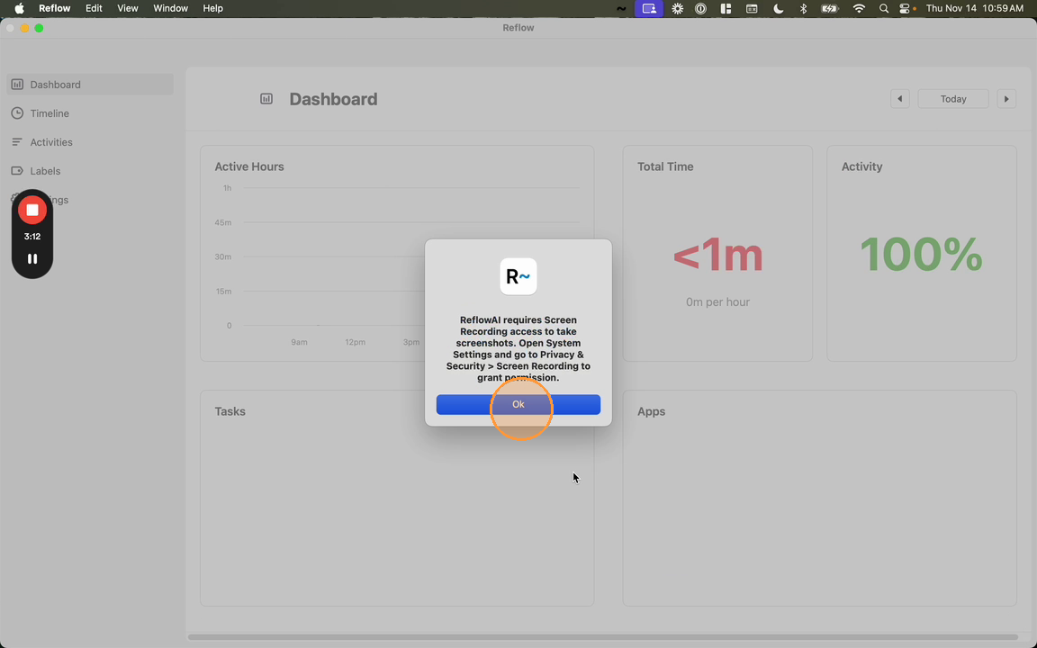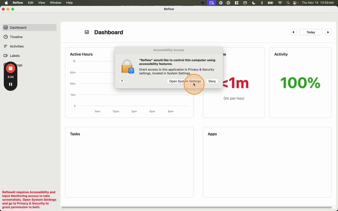 When you start using Reflow, different applications will ask for your permission for Reflow to track. Make sure to grant the permission, every time it’s asked. It’ll look something like this: