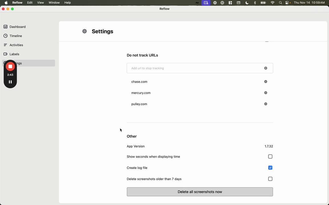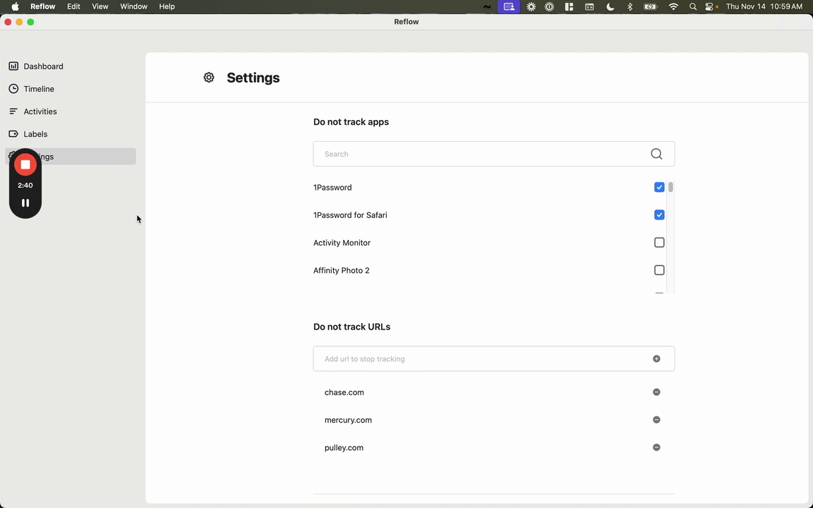 Now that the application is ready to use, you will see the timeline and your activities. You can create and track labels, as well as define which apps or URLs you do not want Reflow to monitor.
