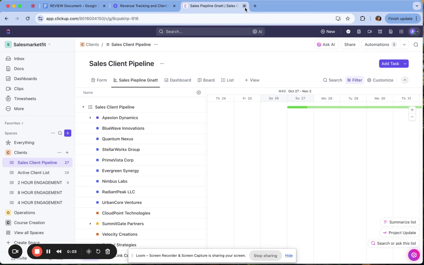 You can choose from default statuses provided by ClickUp or create your own. Examples of task statuses include "Proposal Sent," "In Progress," "Paused," and "Not Interested."