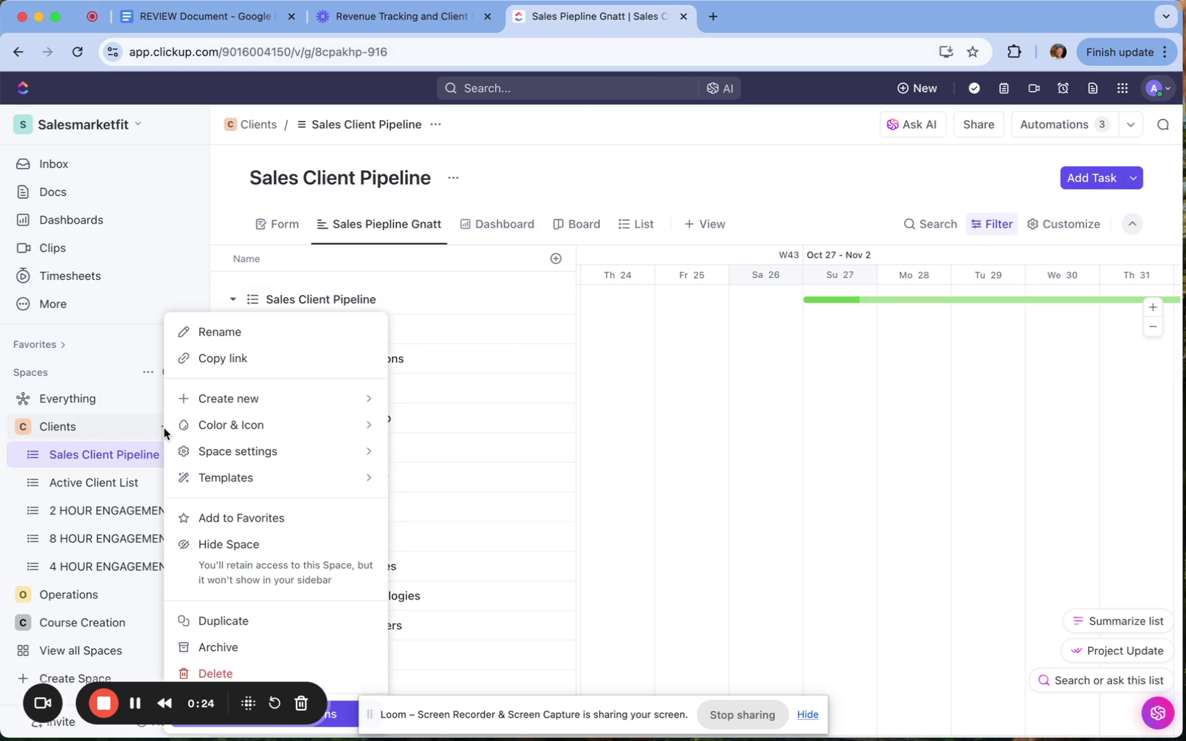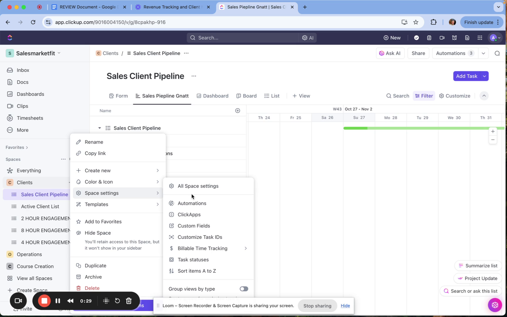 Within the space settings, you will have the option to check automations, add custom fields, and customize task IDs, particularly if you are tracking billing.