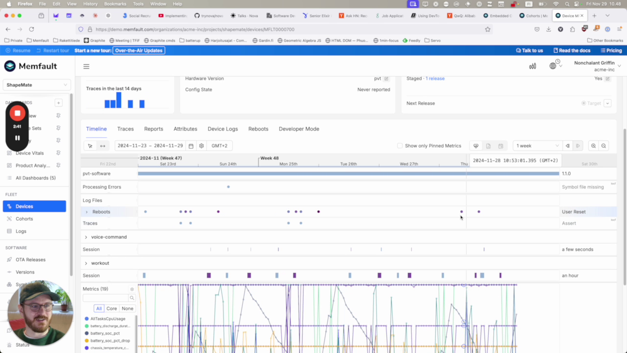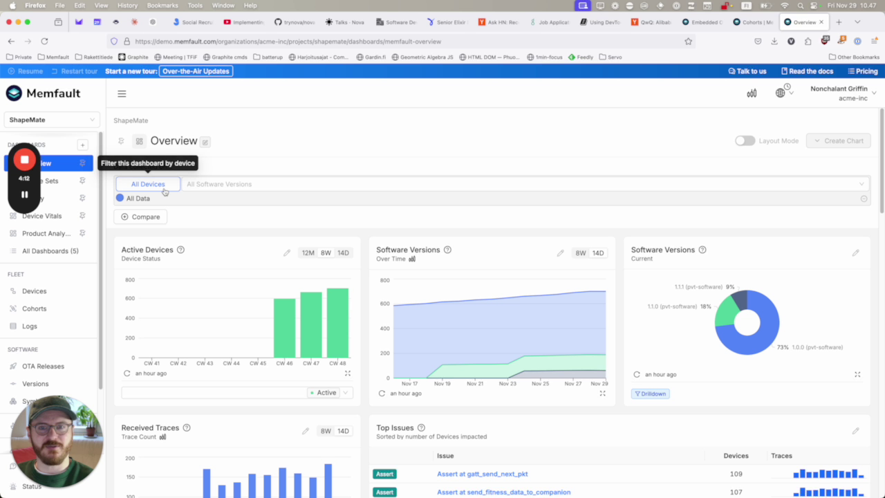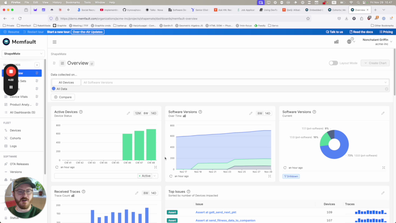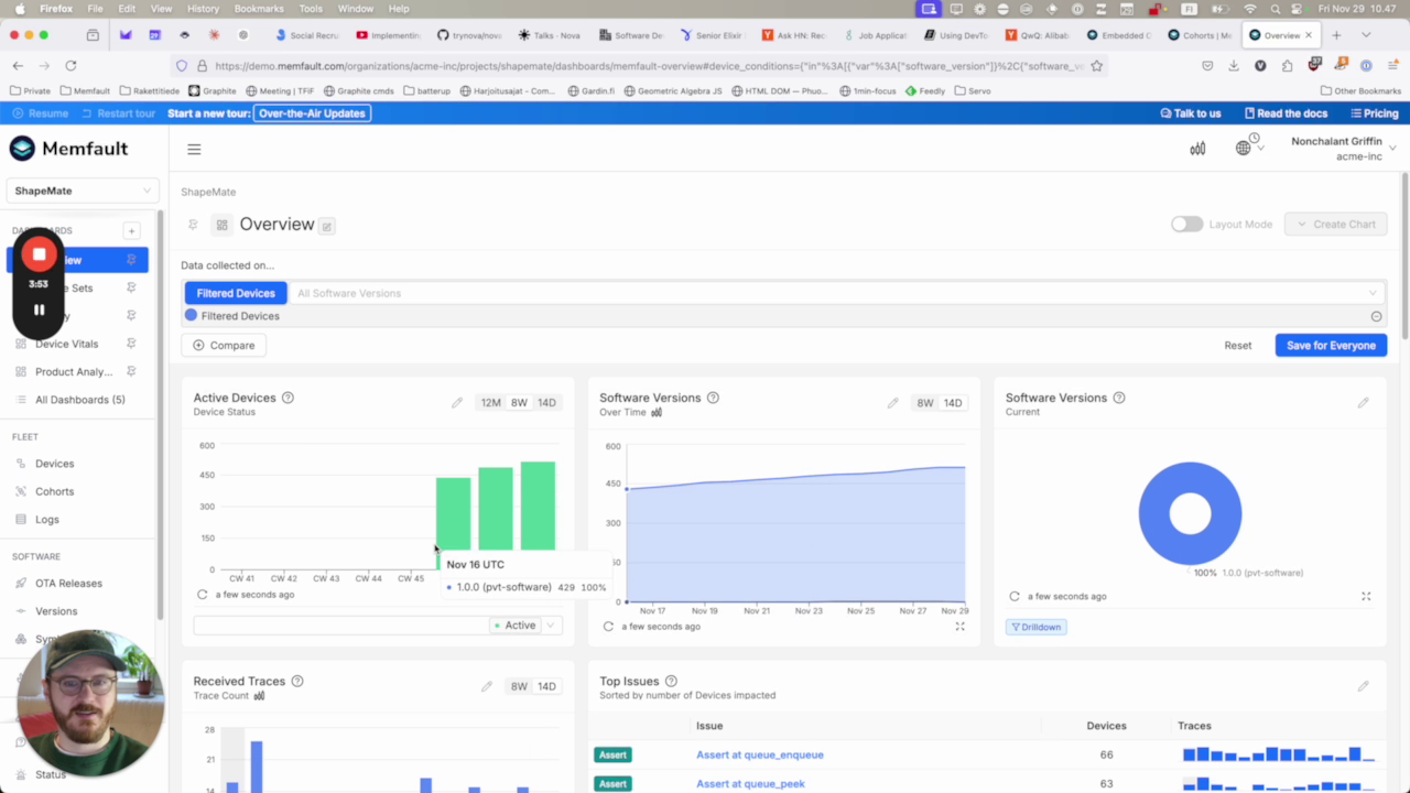 This guide provides a detailed walkthrough of the Memfault demo, showcasing the various functionalities of the dashboard and data views. Intended for users interested in understanding the capabilities of Memfault's platform, this guide will cover the main features, including dashboard navigation, data filtering, chart customization, and the unique time sync mode. By the end of this guide, users should have a clear understanding of how to navigate and utilize the Memfault dashboard effectively.