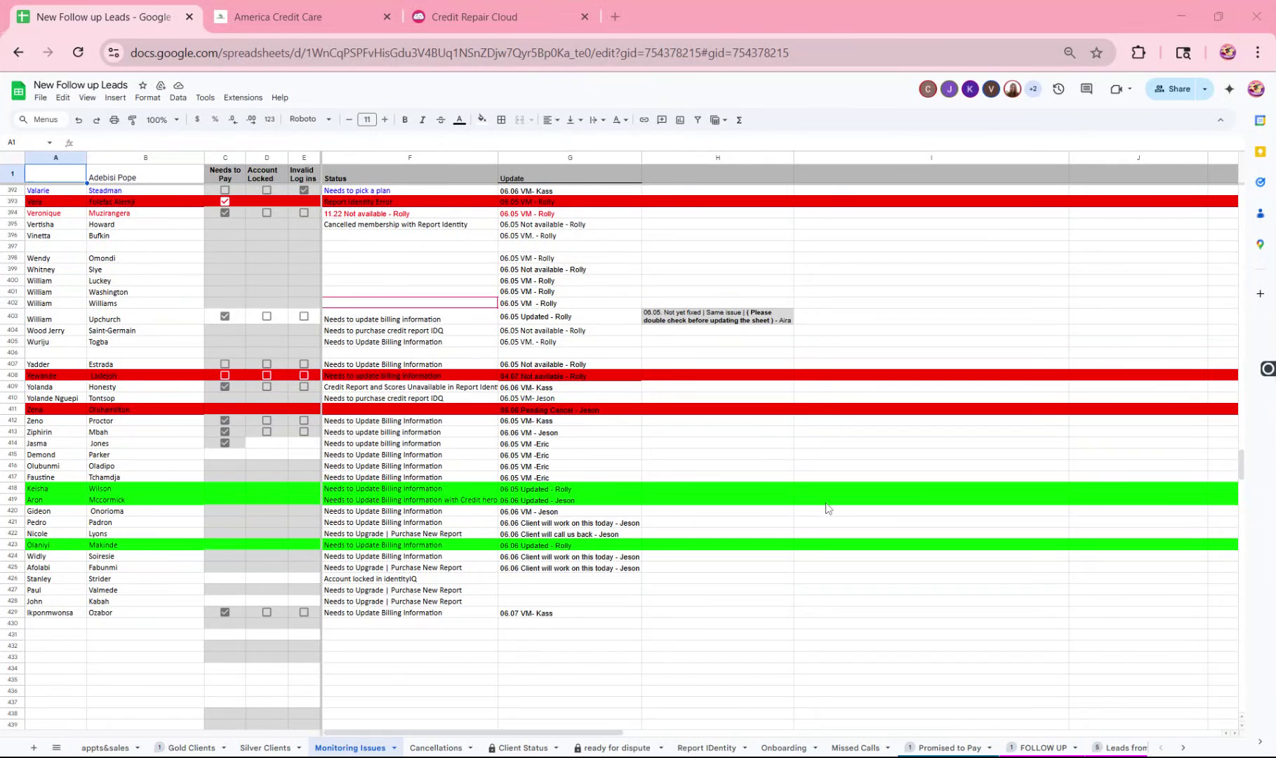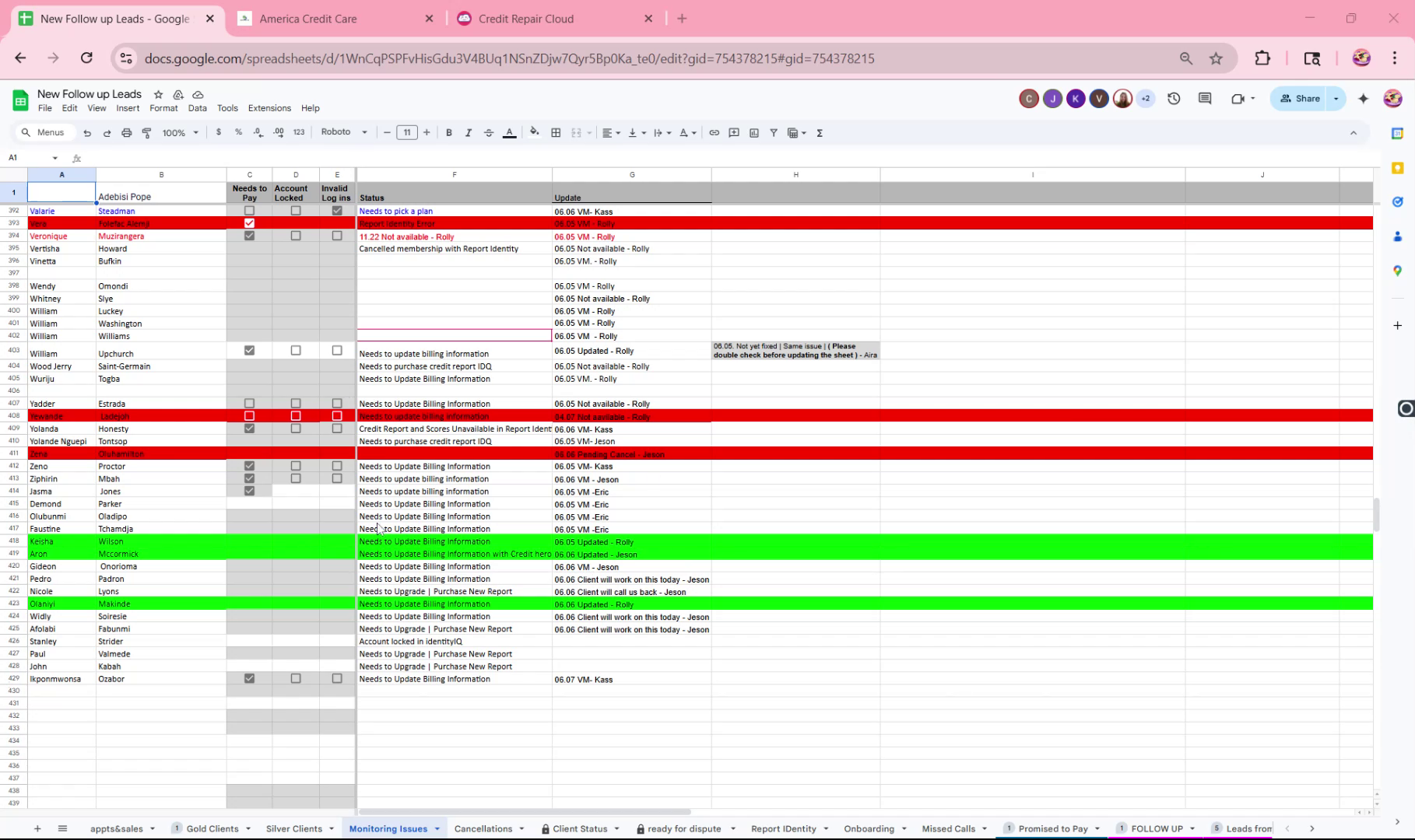 Access the "Monitoring Issues" tab in the Excel sheet to find the list of clients experiencing issues.