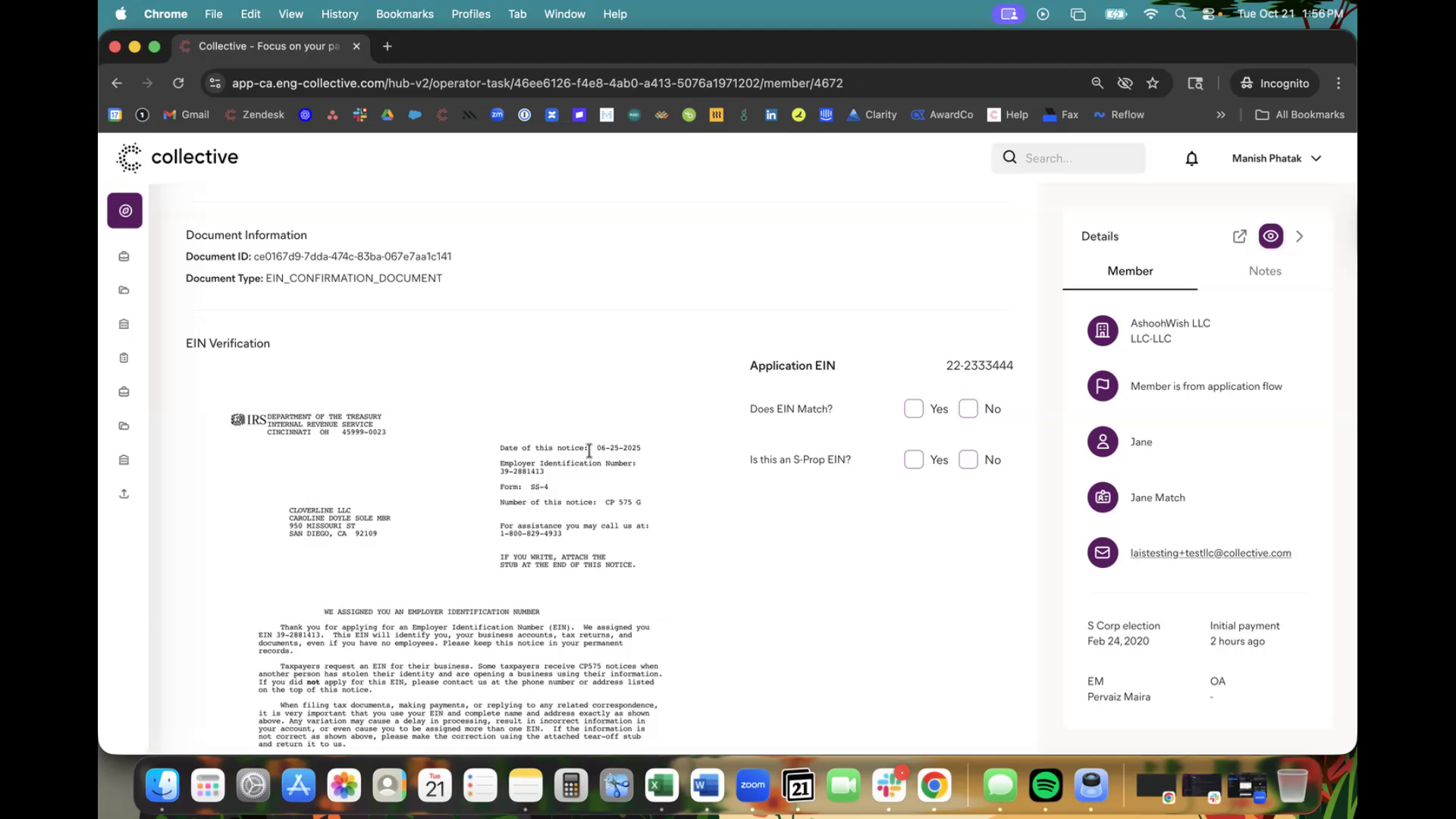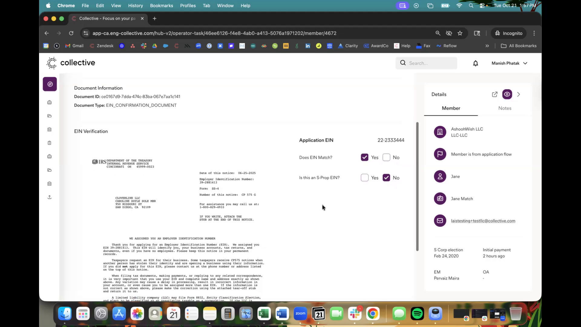For SC to SC members, verify the S Corp approval letter by clicking into the task. Ensure the EIN matches the letter and the S Corp election date is accurate.