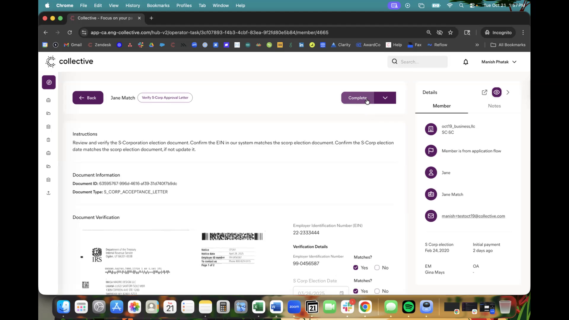 After verifying the S Corp details, hit "Complete" to finalize this verification process.