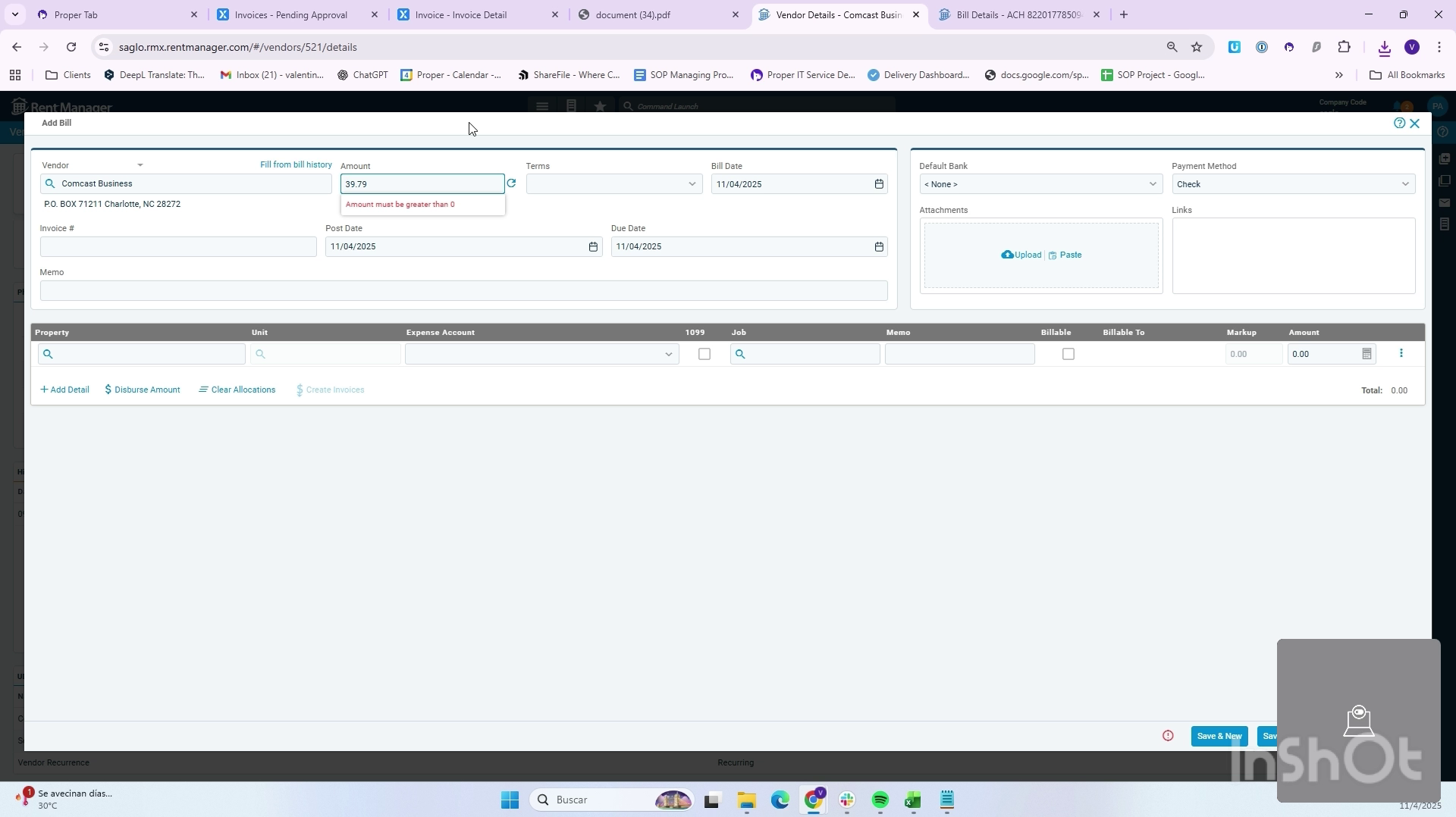 Switch to Rent Manager to process utility invoices. Select the appropriate invoice, open it, and ensure all vendor details match the invoice.