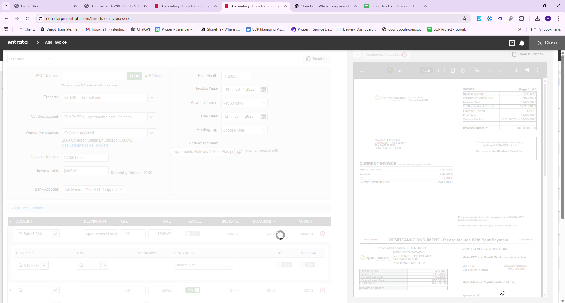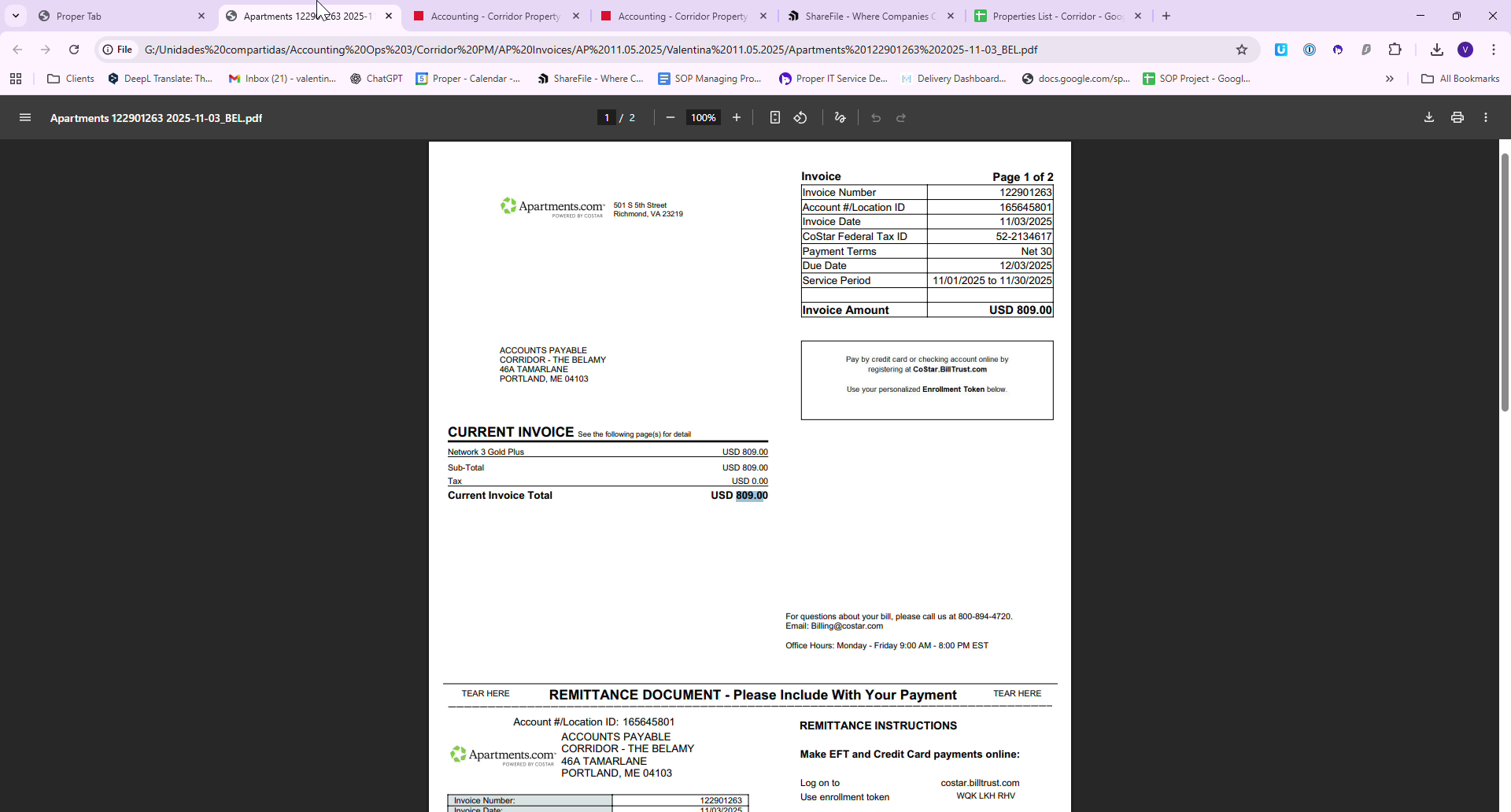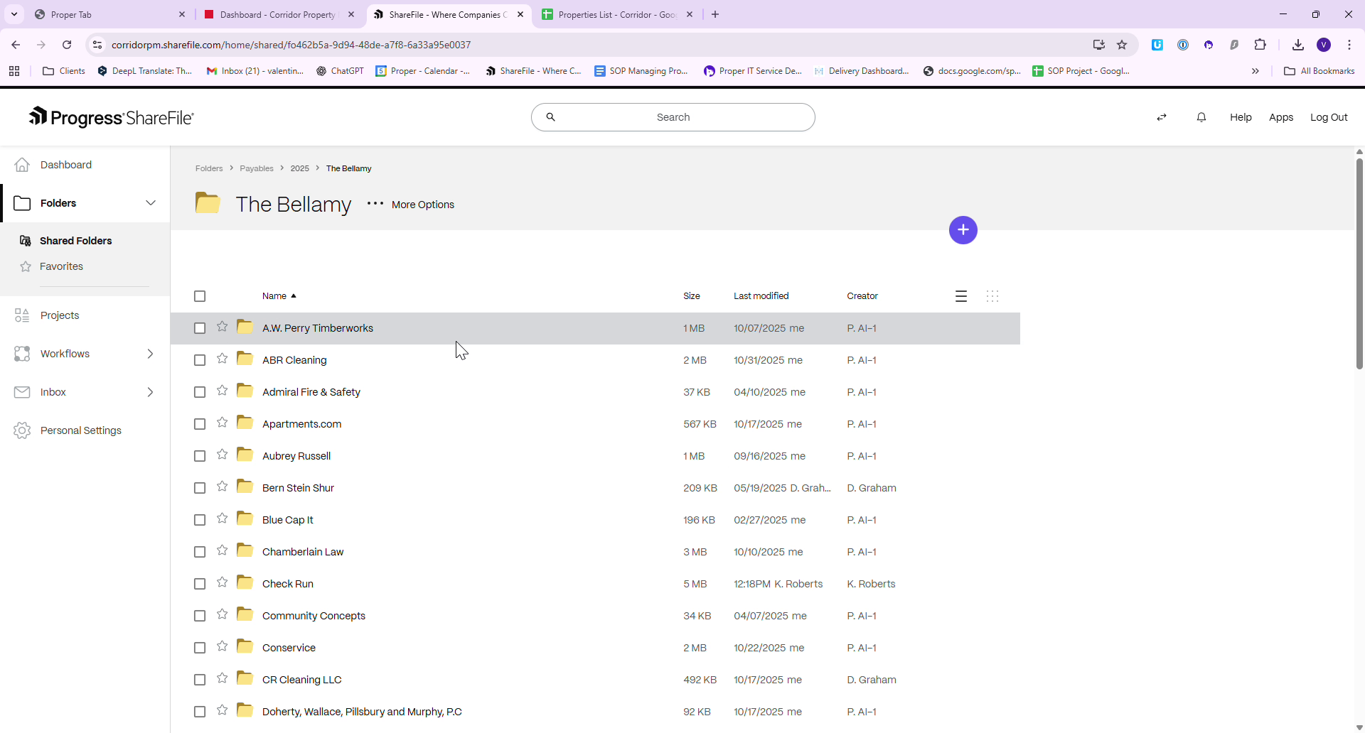 Access ShareFile where all Corridor processed invoices are stored. Locate the appropriate vendor folder, in this case, Bellamay, and save the invoice using a specific naming convention: "Apartments, Invoice Number, Date".
