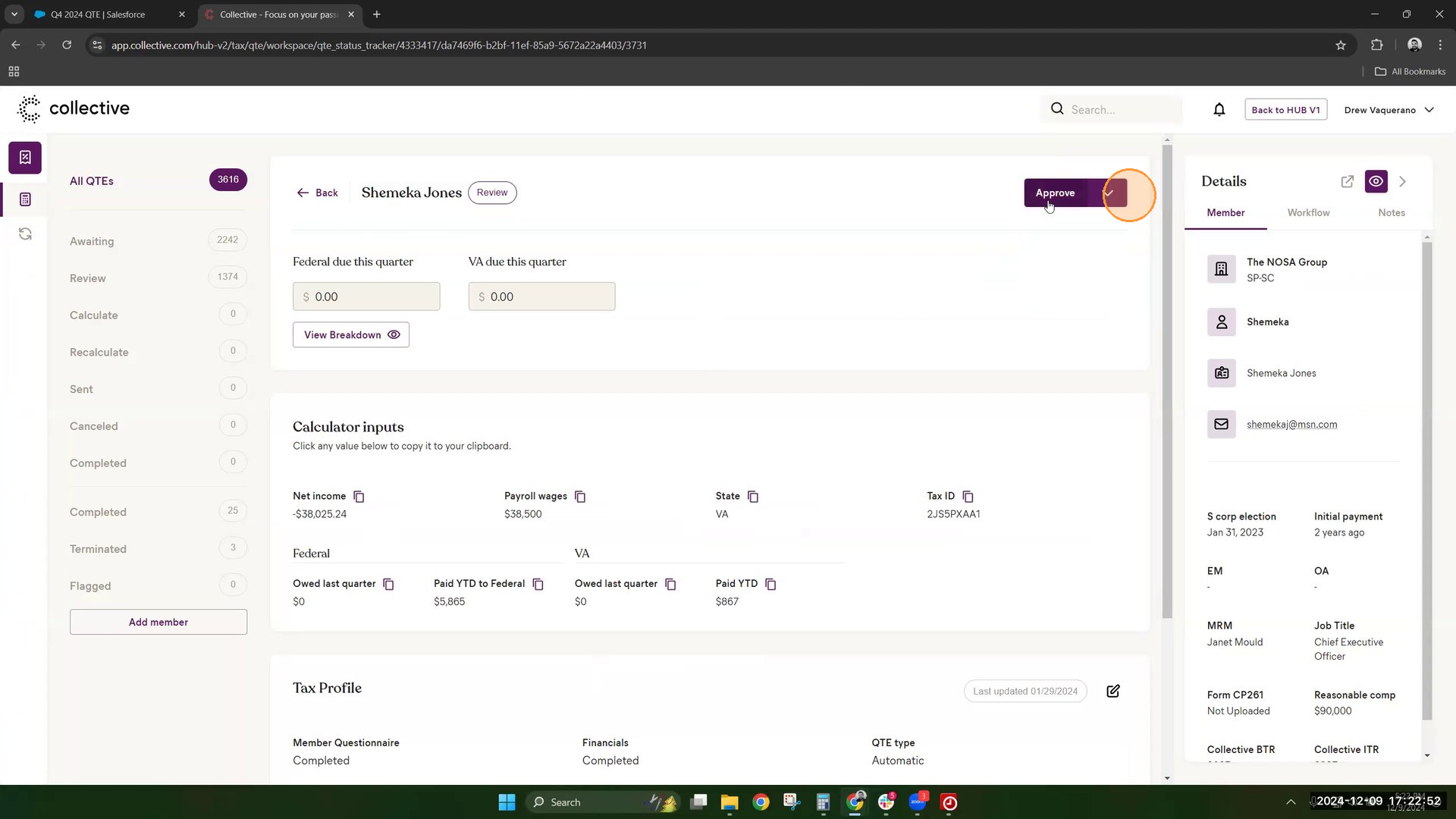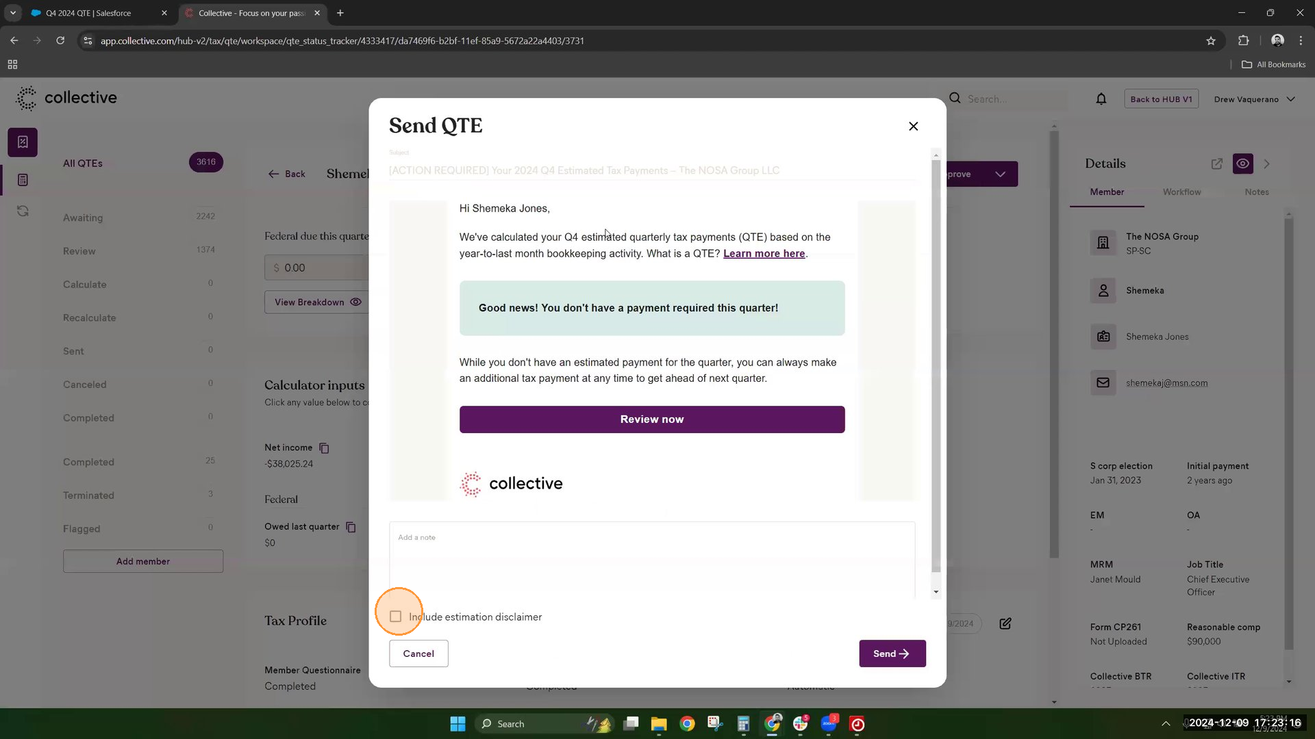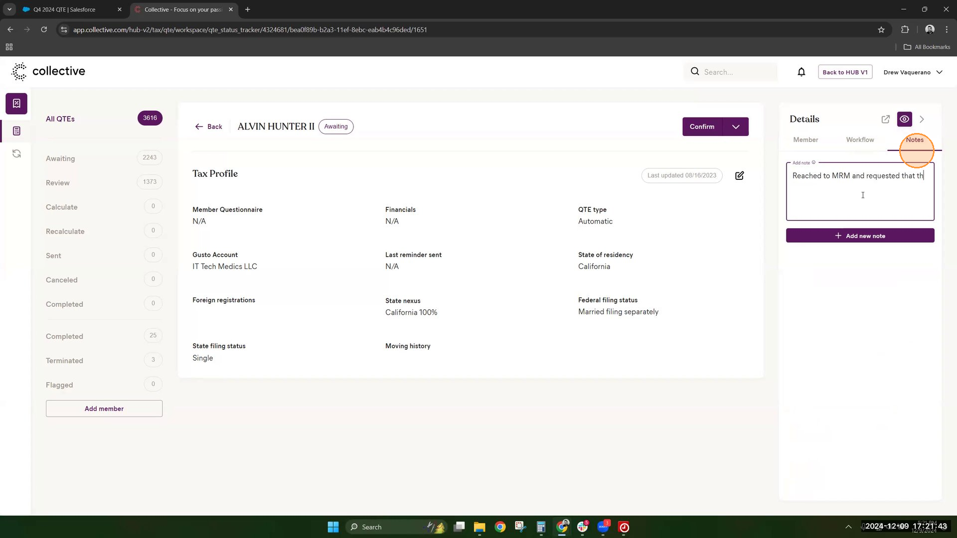 Verify the member’s status. If "Confirm" appears, it indicates that the member needs to update their tax profile. Reach out to the MRM via Slack to inform them that the QTE is ready but the member has not updated their tax profile.