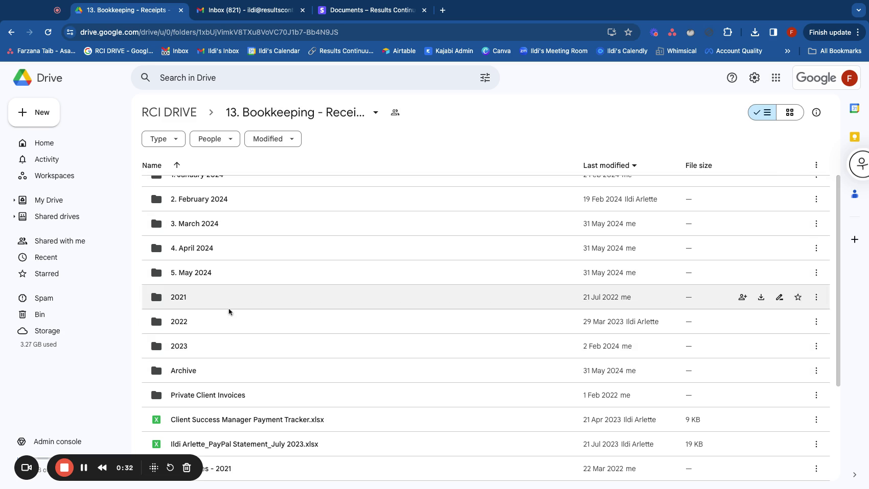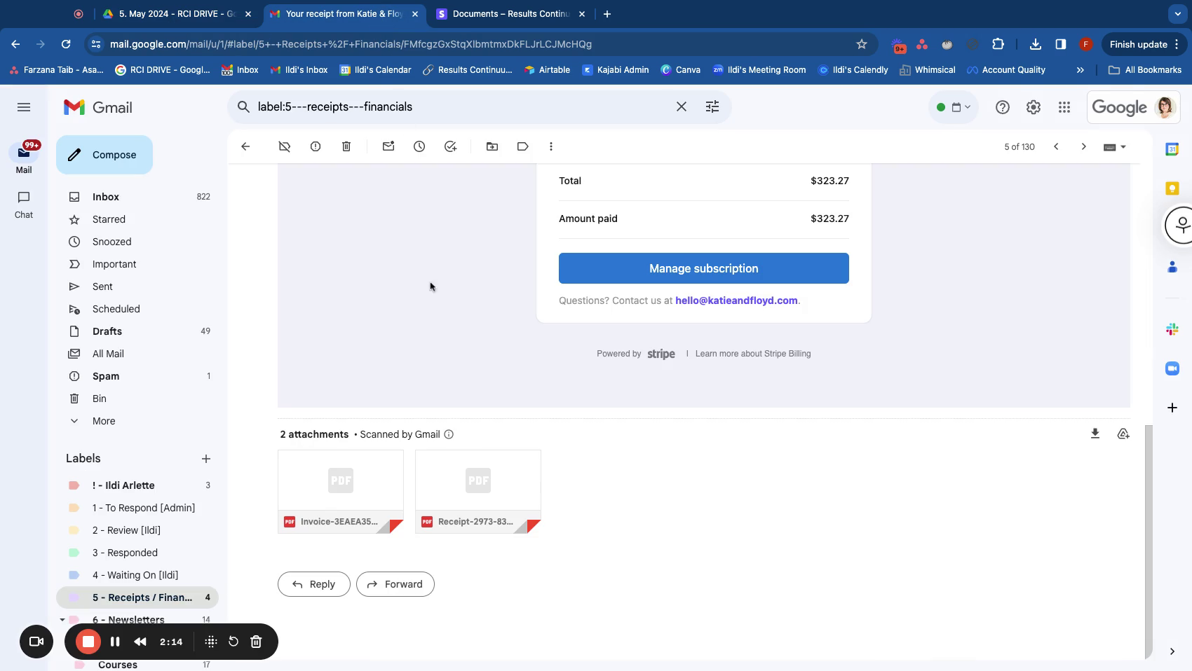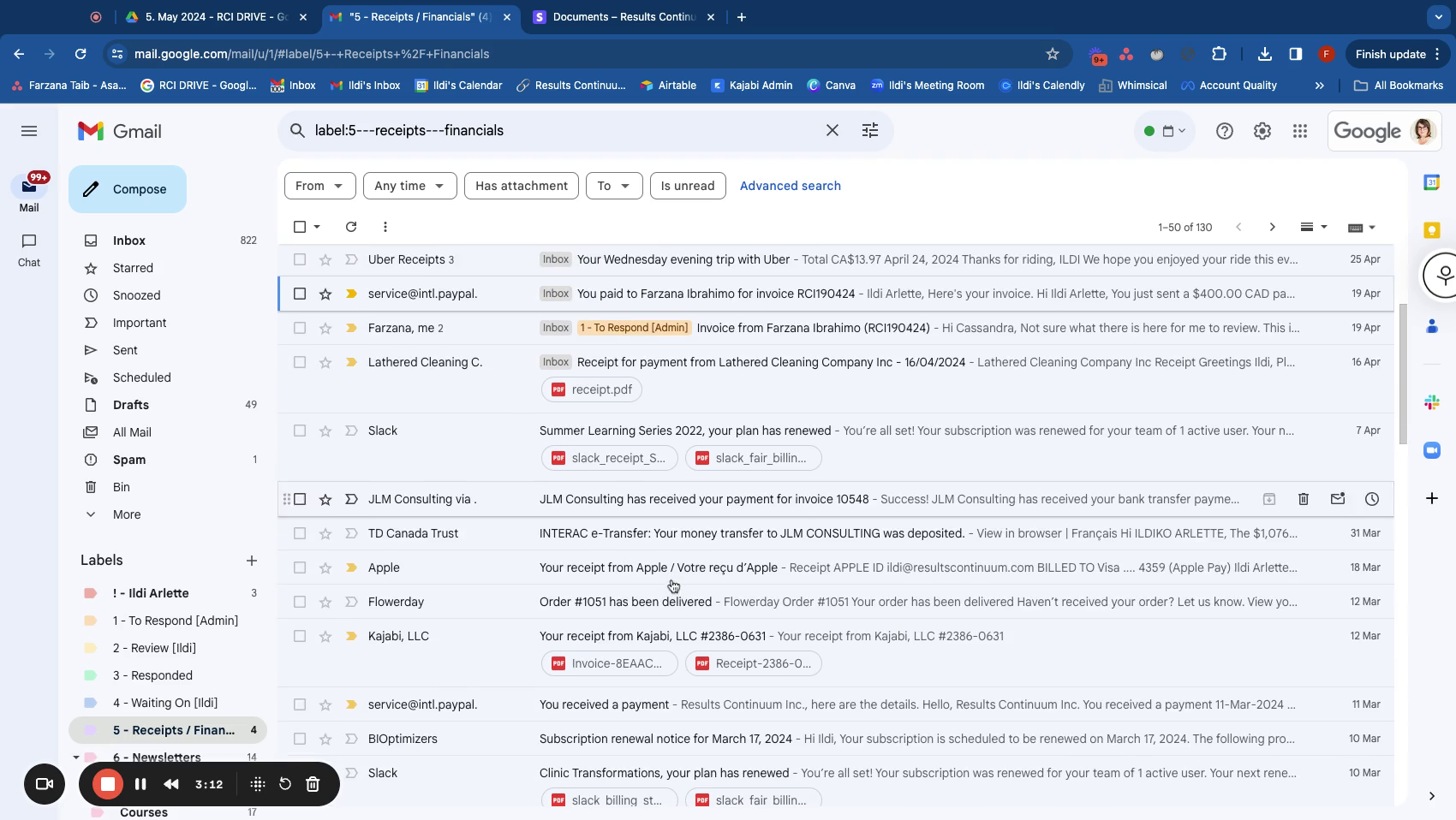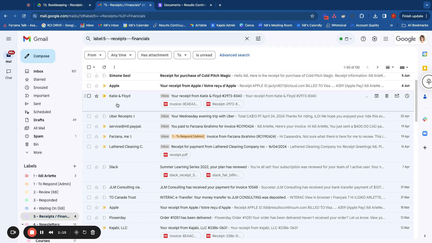 - Navigate to Ildi's inbox and locate Folder 5, which contains Receipts and Financials. Download all invoices and statements for the designated period.