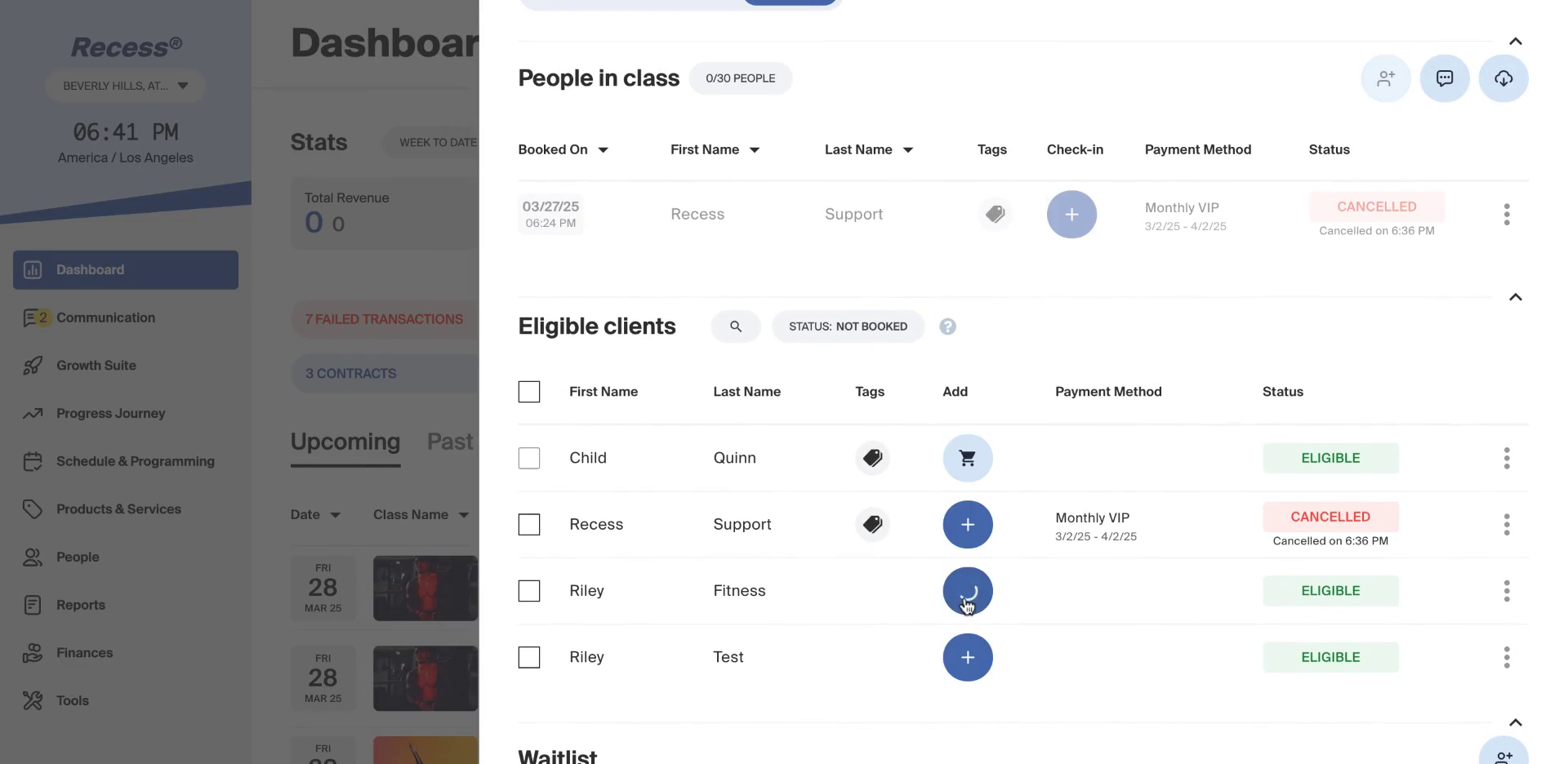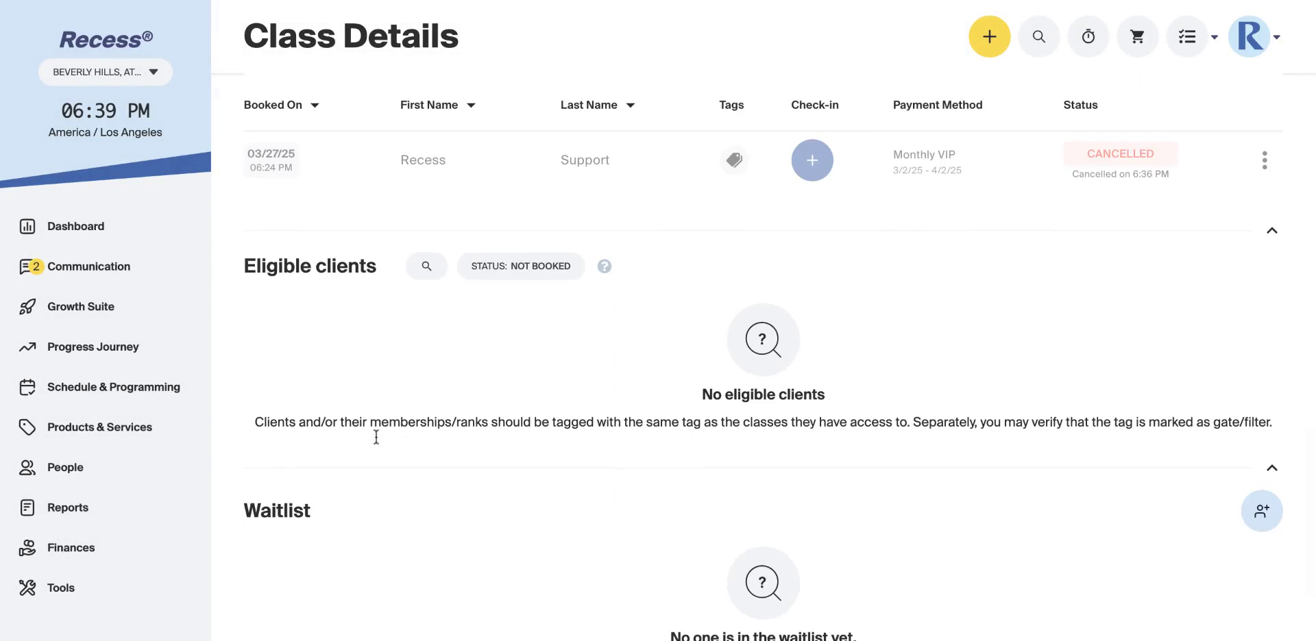 By following this guide, you have learned how to activate and utilize the Roster Eligibility feature to control class visibility based on specific member criteria. This tool enhances the organization and efficiency of your class management, ensuring members access only the classes they are eligible to attend. If you have further questions, please contact support at recess.kiosk.