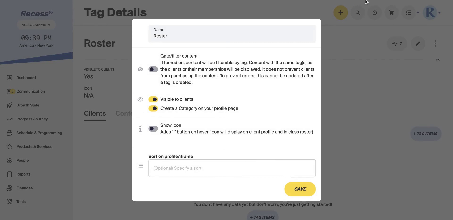 Initially, the roster will not display any eligible members. To populate this list, you need to assign tags to your classes and members. Start by creating a new tag, such as "roster," and edit it to enable the gate filter content. This will control the visibility of classes for tagged members.
