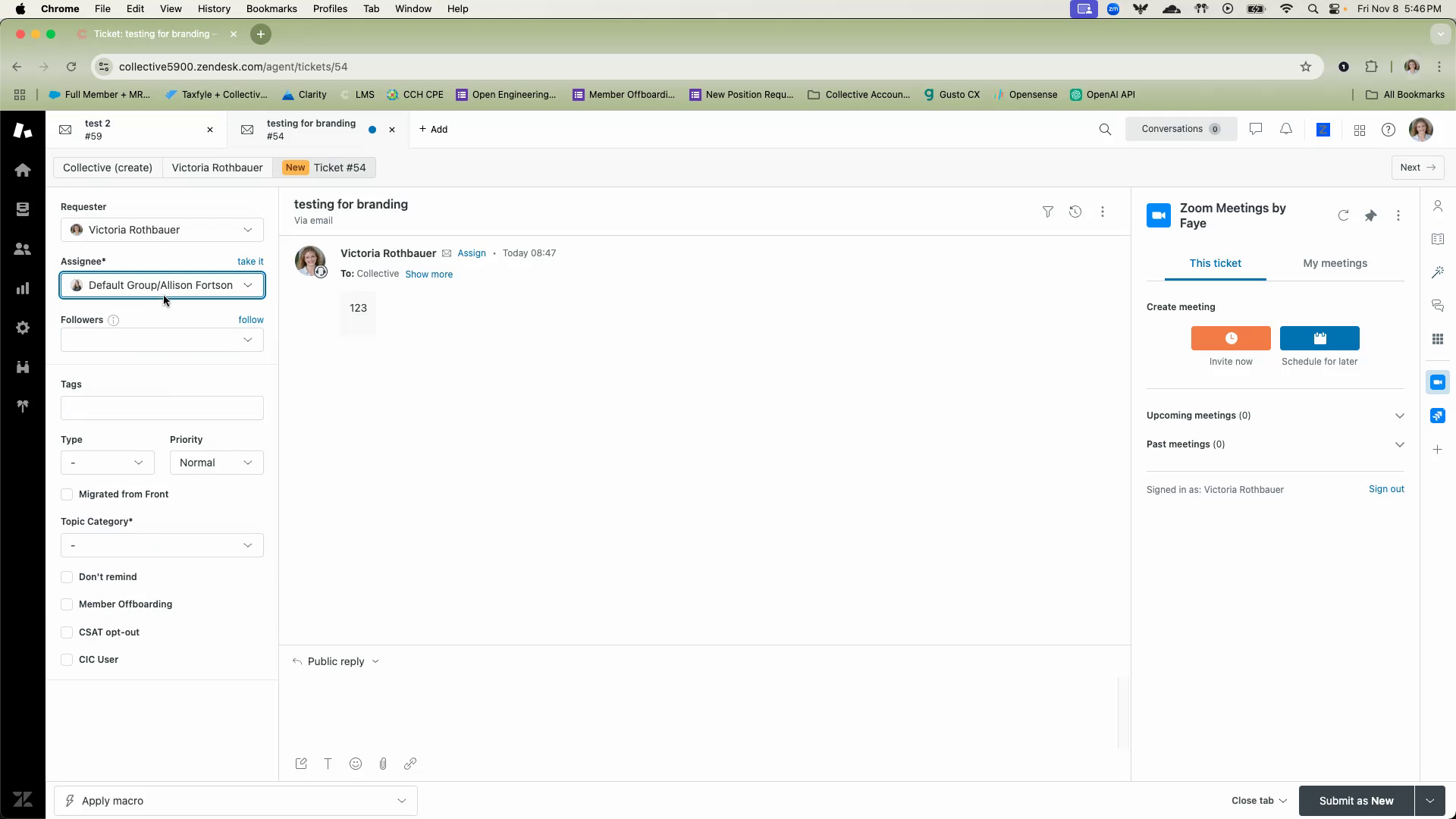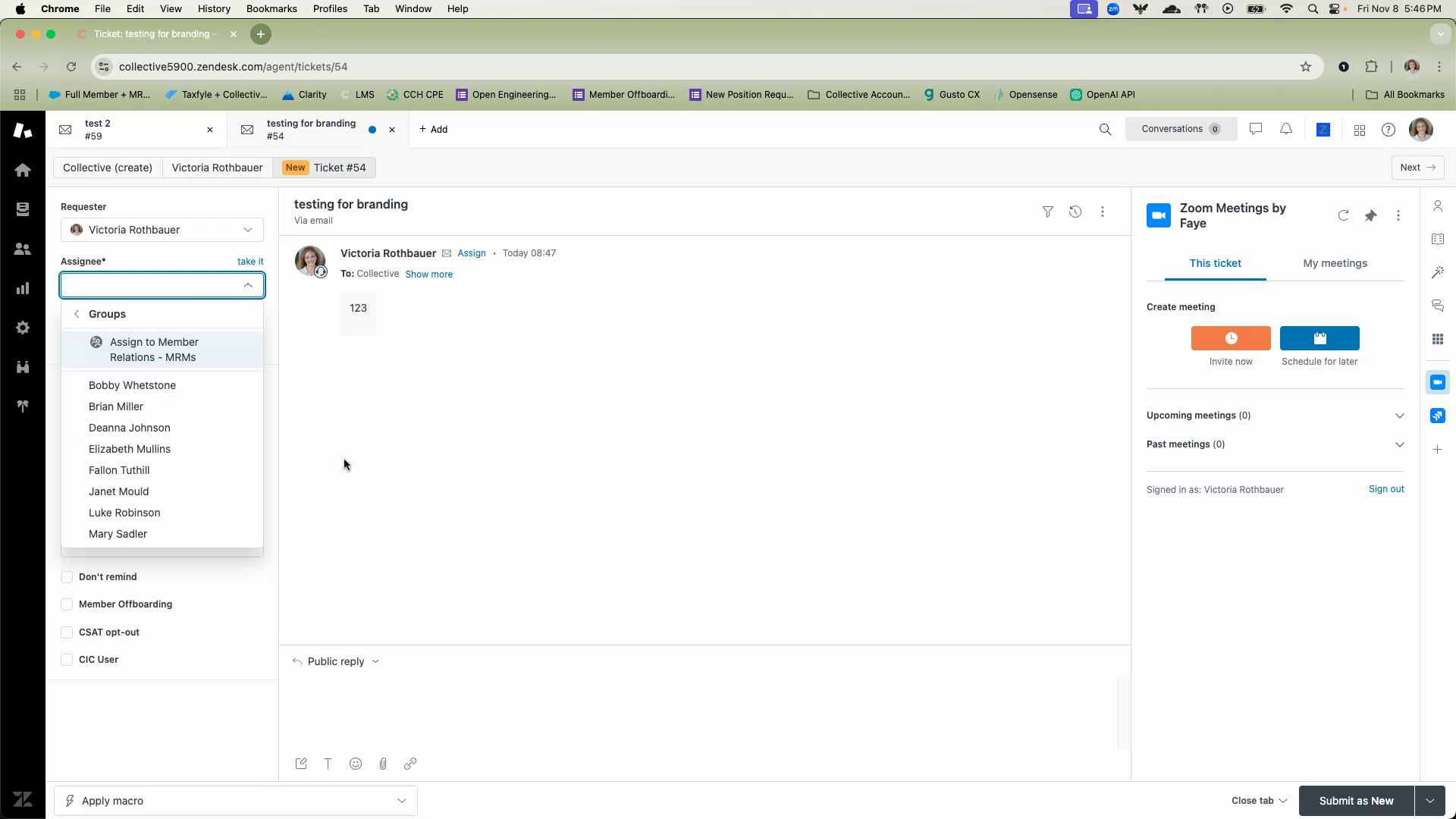 You can view the current assignment of a ticket by selecting it in your Zendesk interface. For instance, you might see that a ticket labeled "testing for branding" is currently assigned to a specific group.