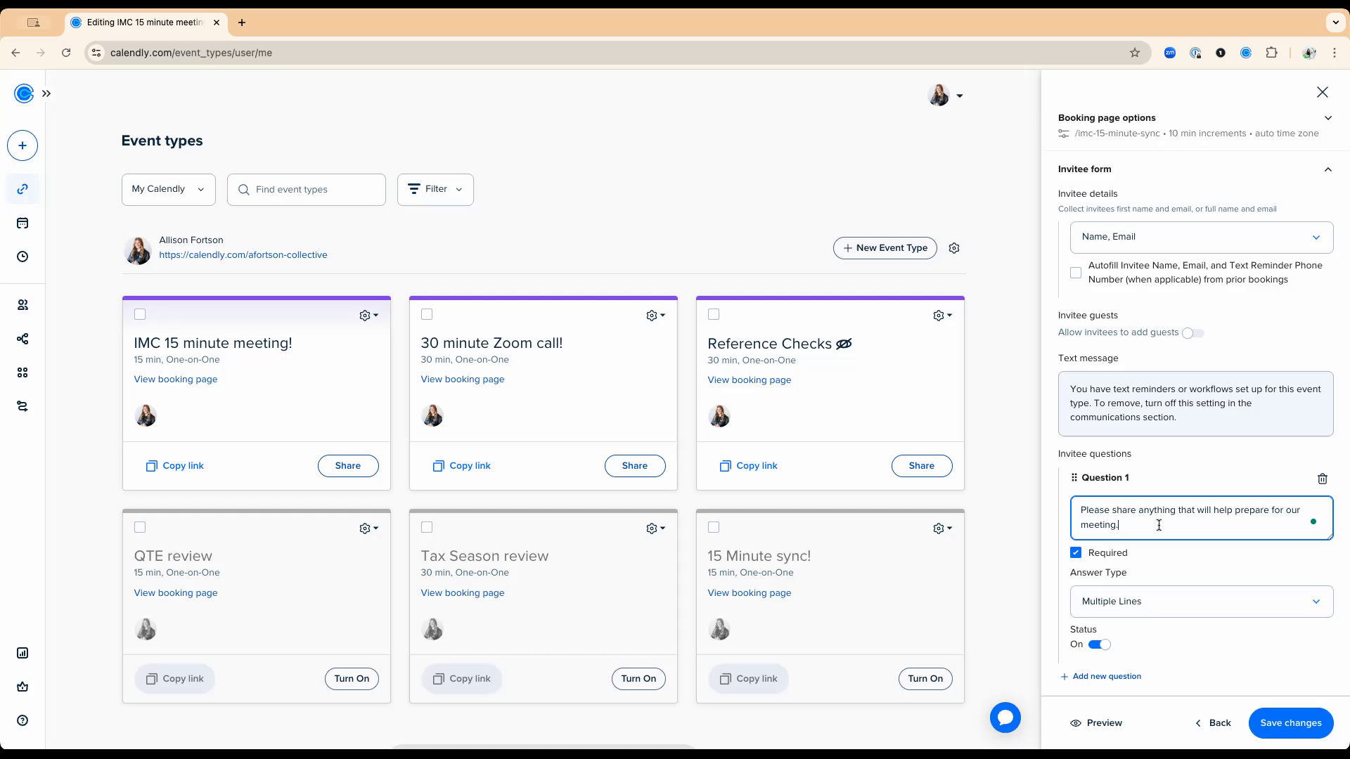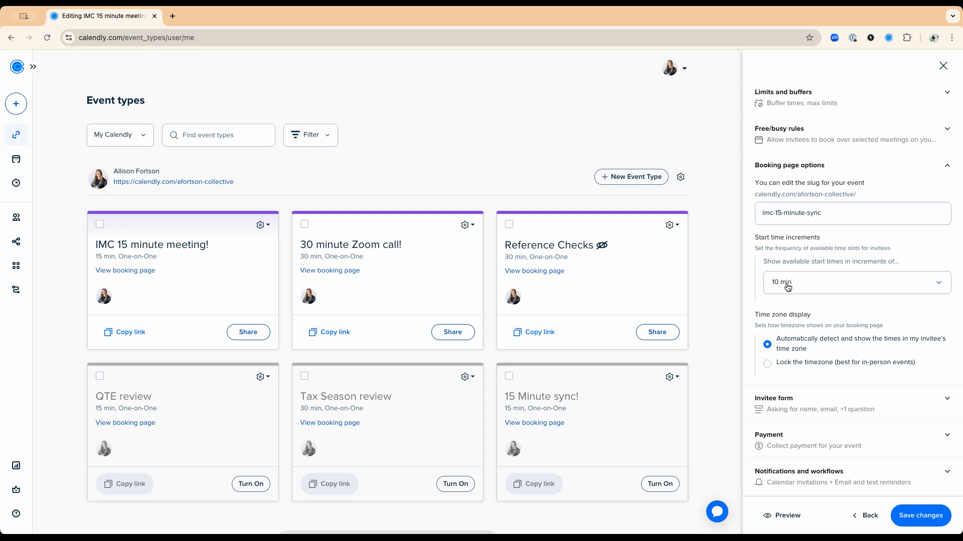 Access the event type by clicking the edit button to the right side of your Calendly page. This will open a drawer with various settings.