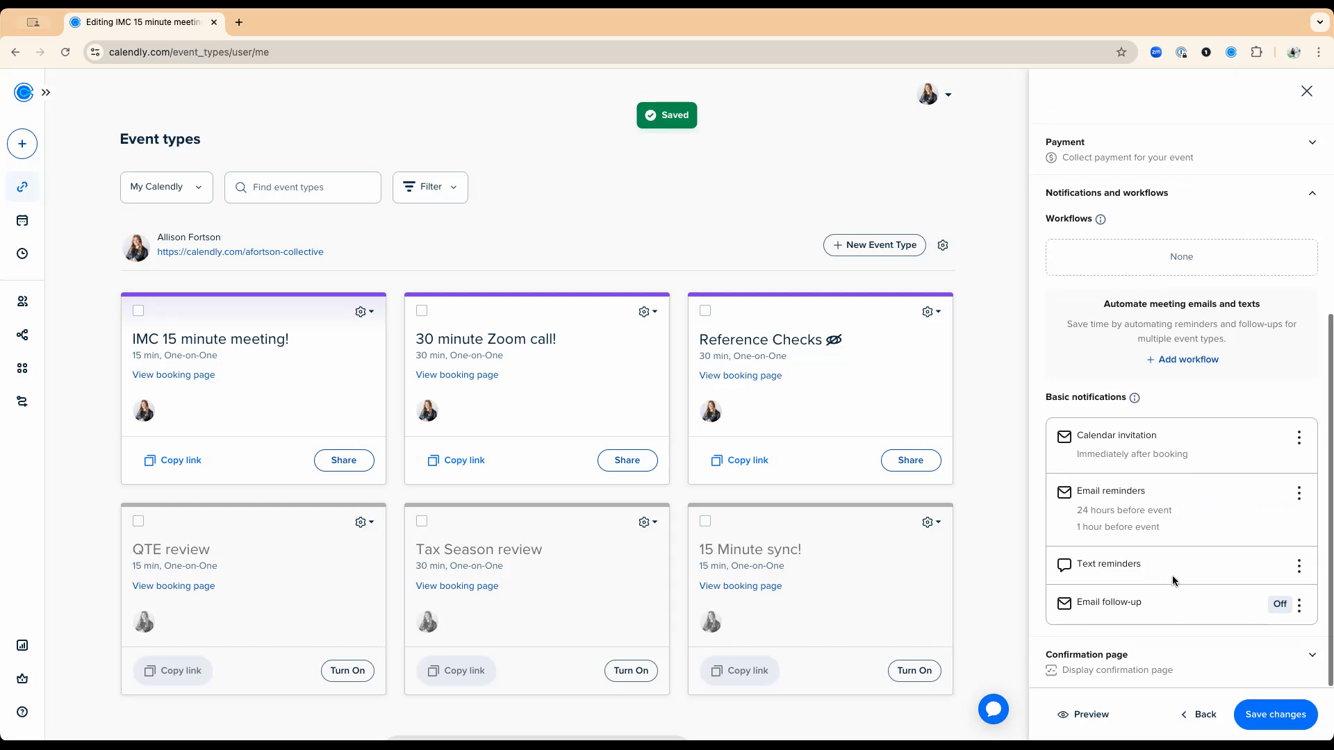 Ensure that invitees receive a calendar invitation immediately after booking. Add an email reminder 24 hours before the event and another an hour before. Activate text reminders to send out 30 minutes before the event.