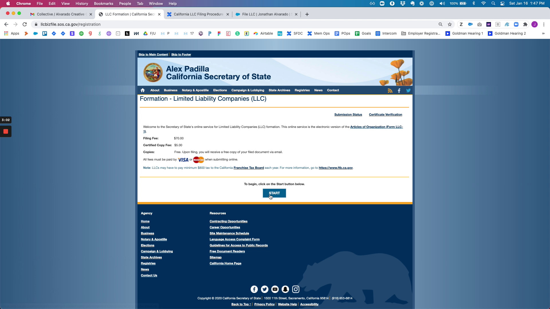 - Navigate to the LLC formation section and click "Start" and "I accept."