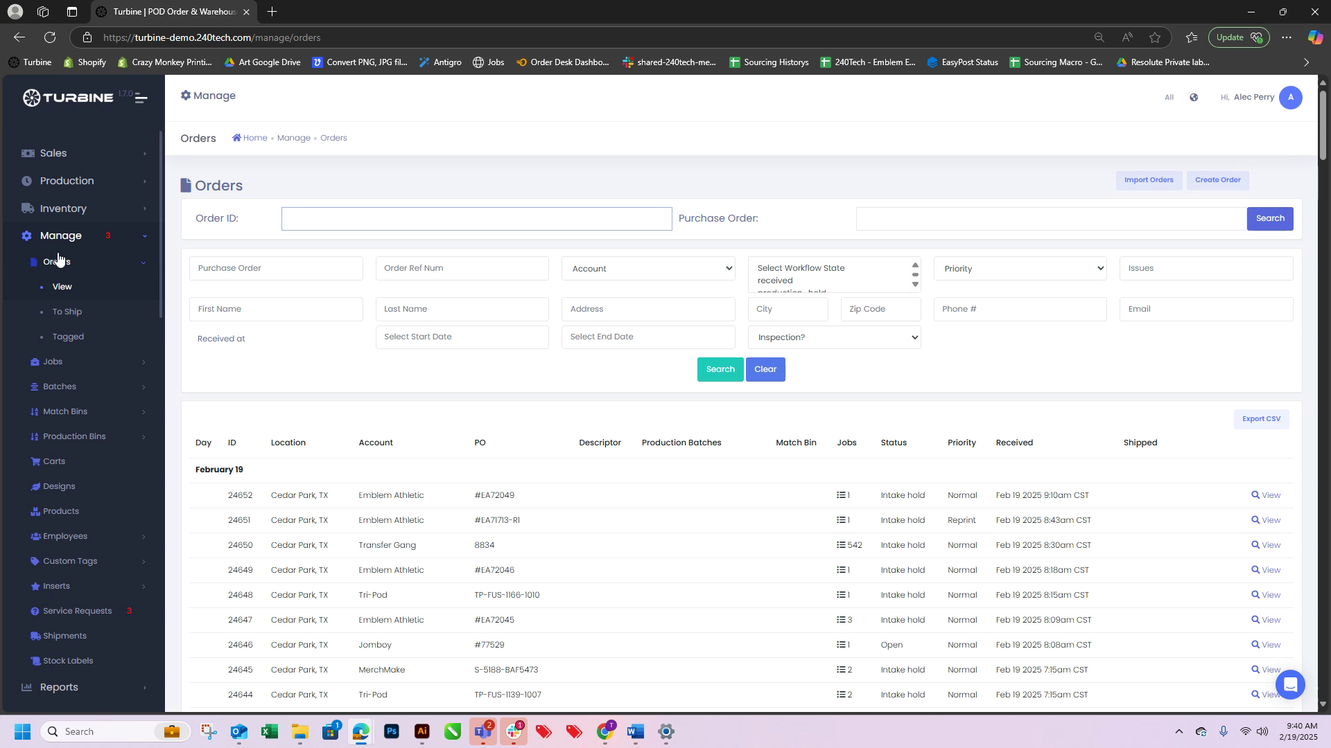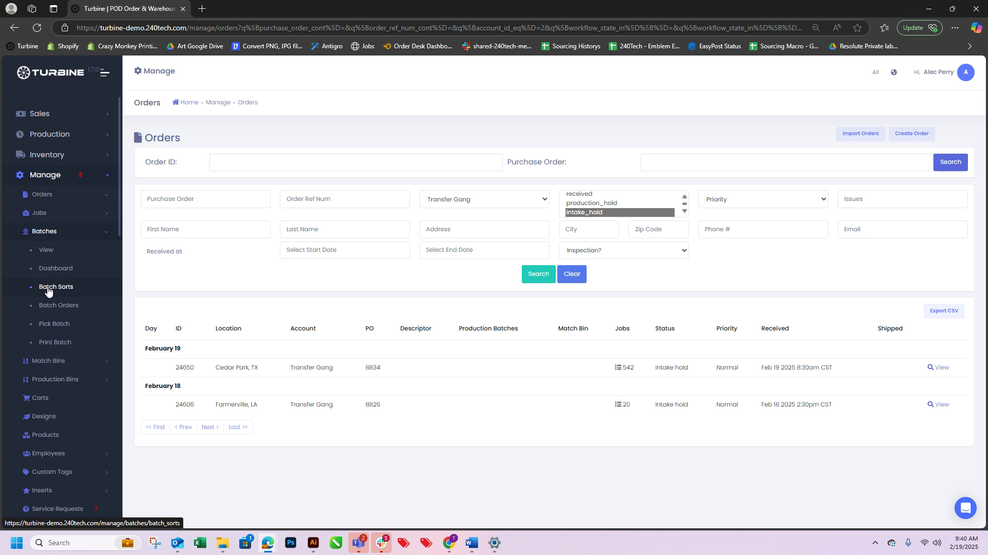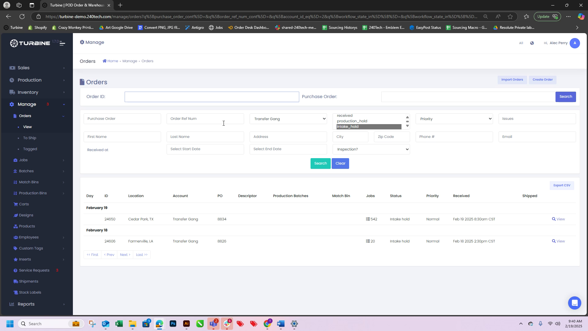 Navigate to the 'Manage' screen to handle orders. By selecting 'Manage Orders View,' you can access a comprehensive list of all your orders. This view allows you to filter orders as needed, such as viewing only transfer gangs or intake items that require printing.
