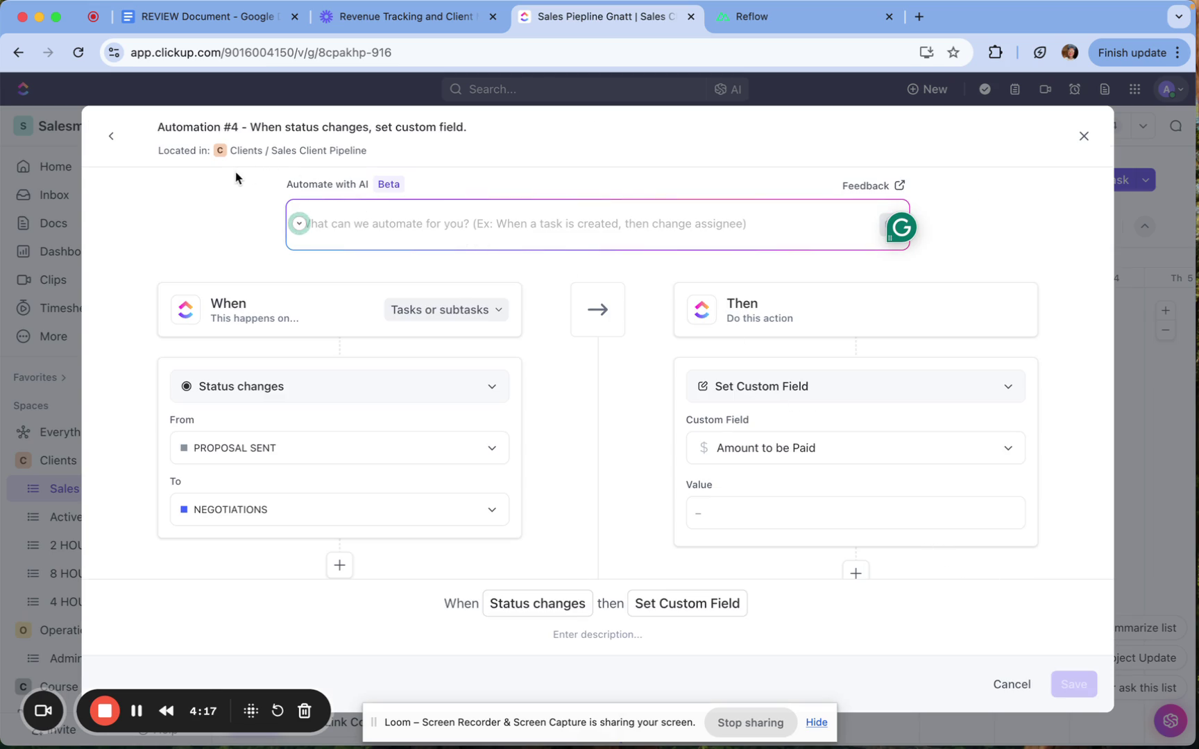 If you create an automation that triggers when a status changes from "Proposal Sent" to "Negotiations," ensure you add specific details about which custom fields are affected.
