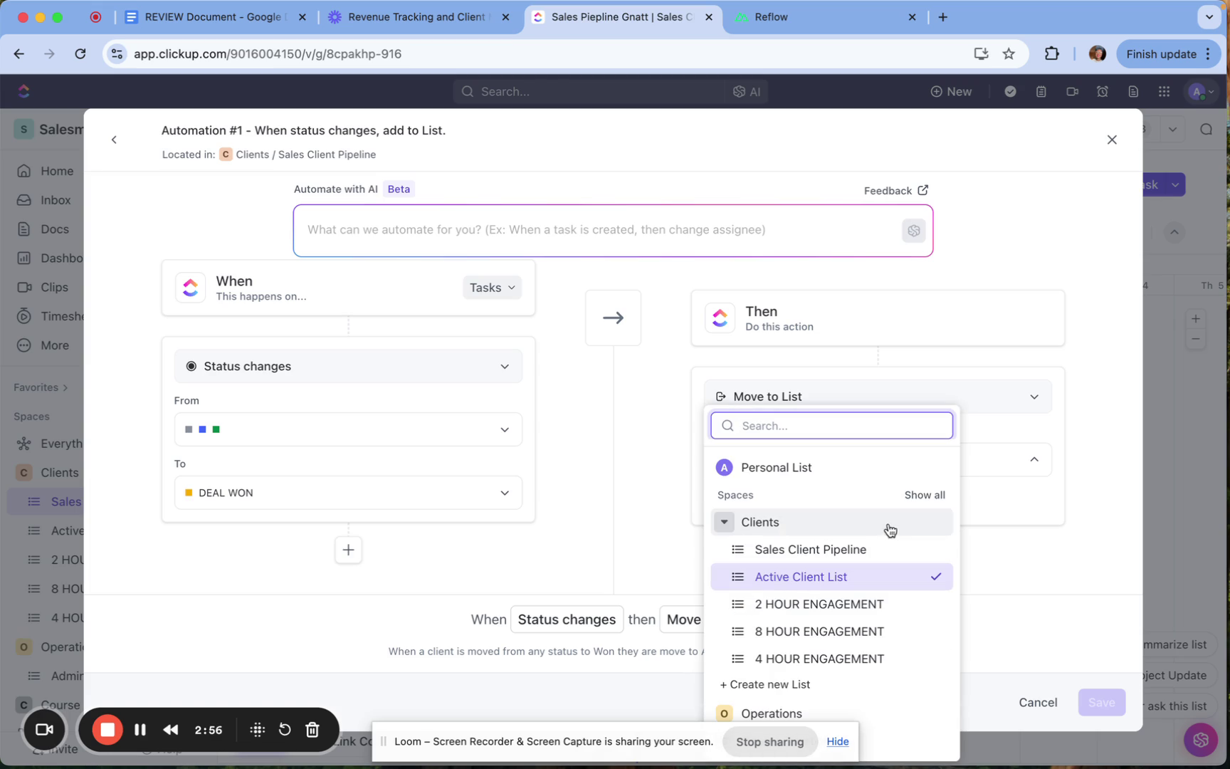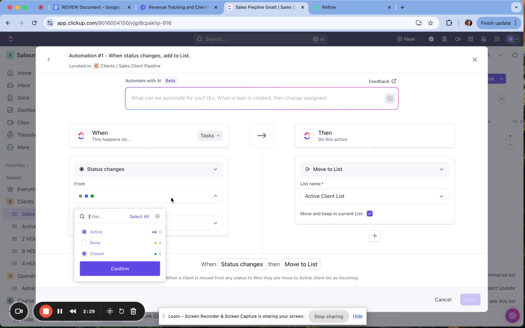 For example, you might set an automation that moves a client from any status to an active client list when their status changes.