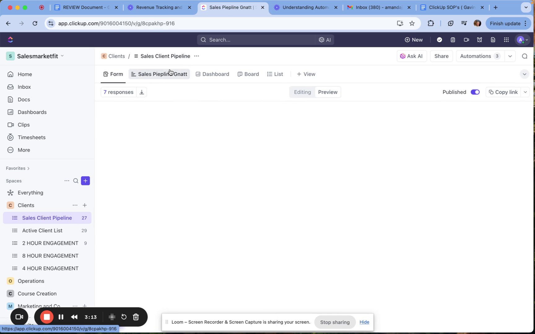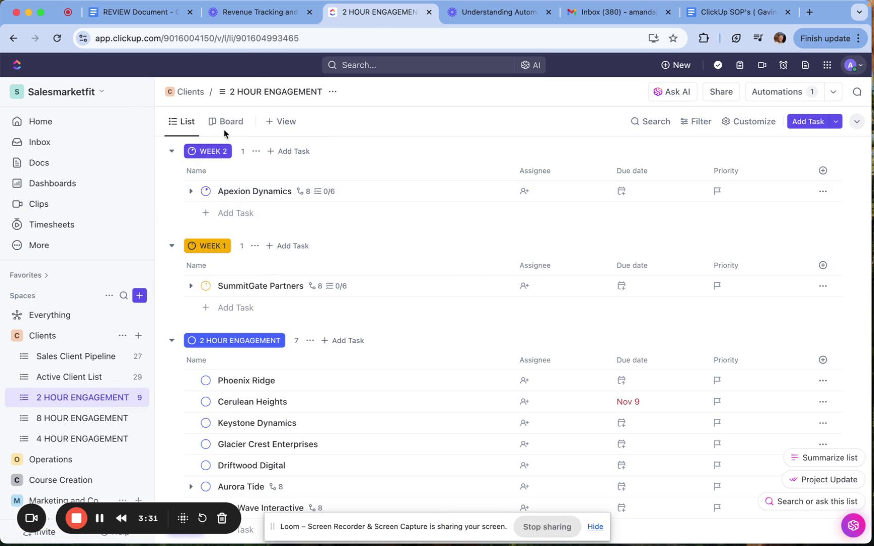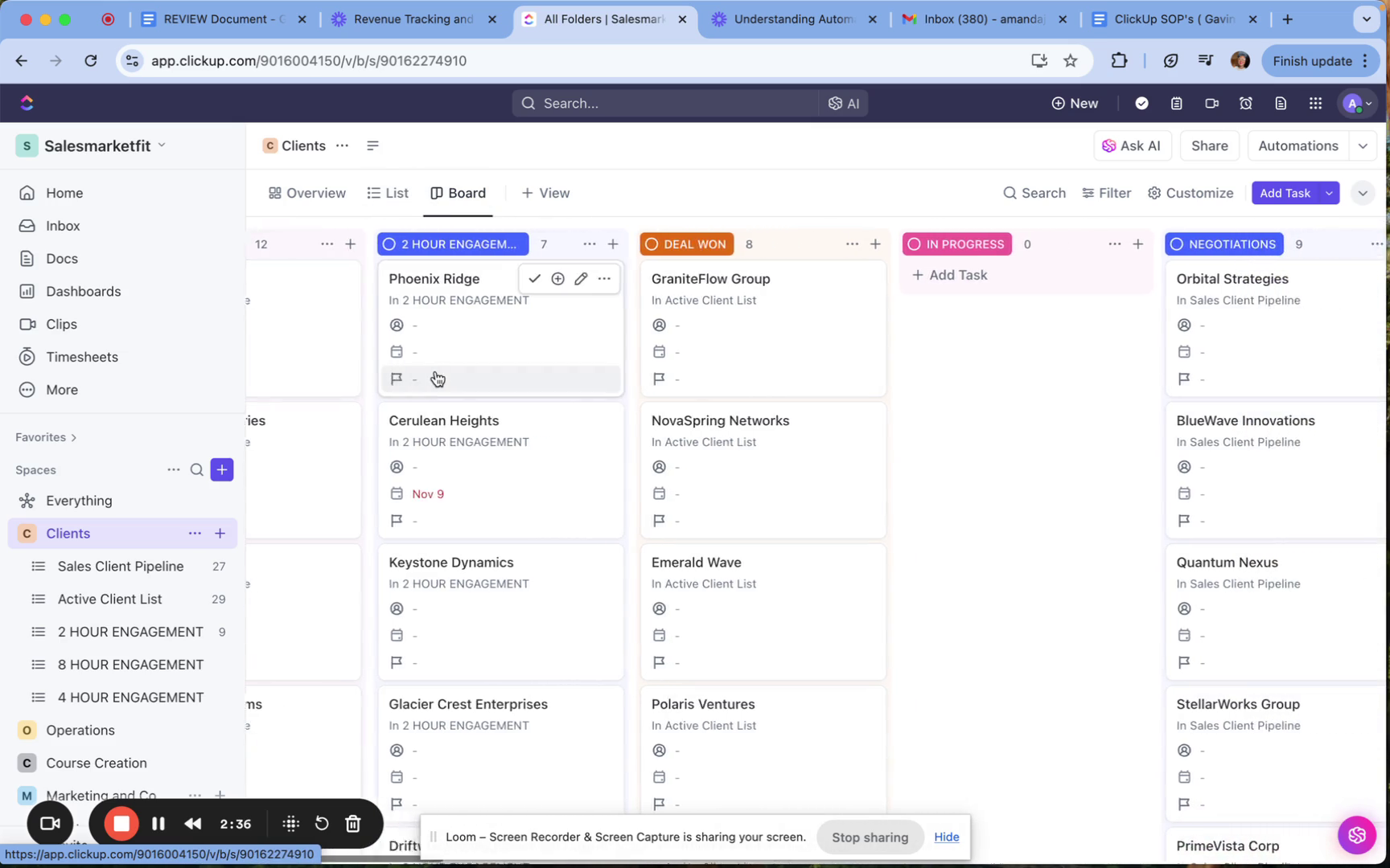 In the active client list, you can create boards and charts, providing various perspectives on your client engagements.