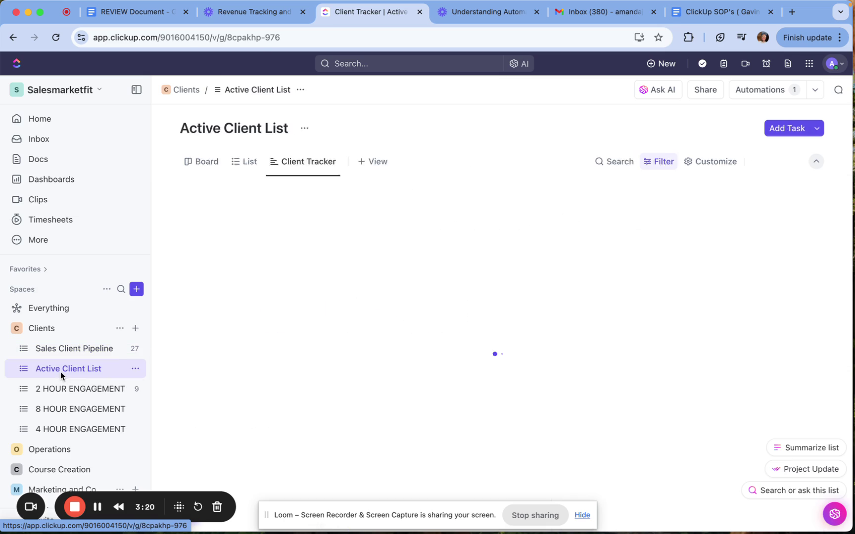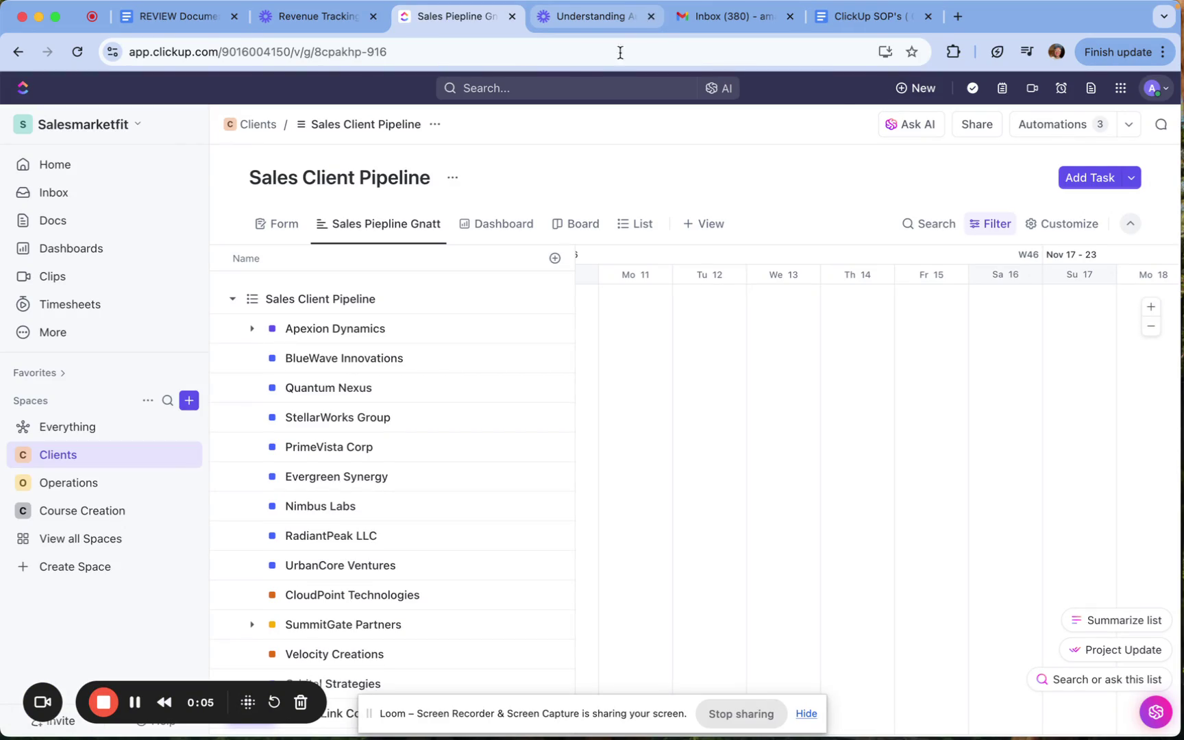 In the client space, you can find all relevant lists such as sales pipelines and active client lists, which are crucial for managing client relationships.