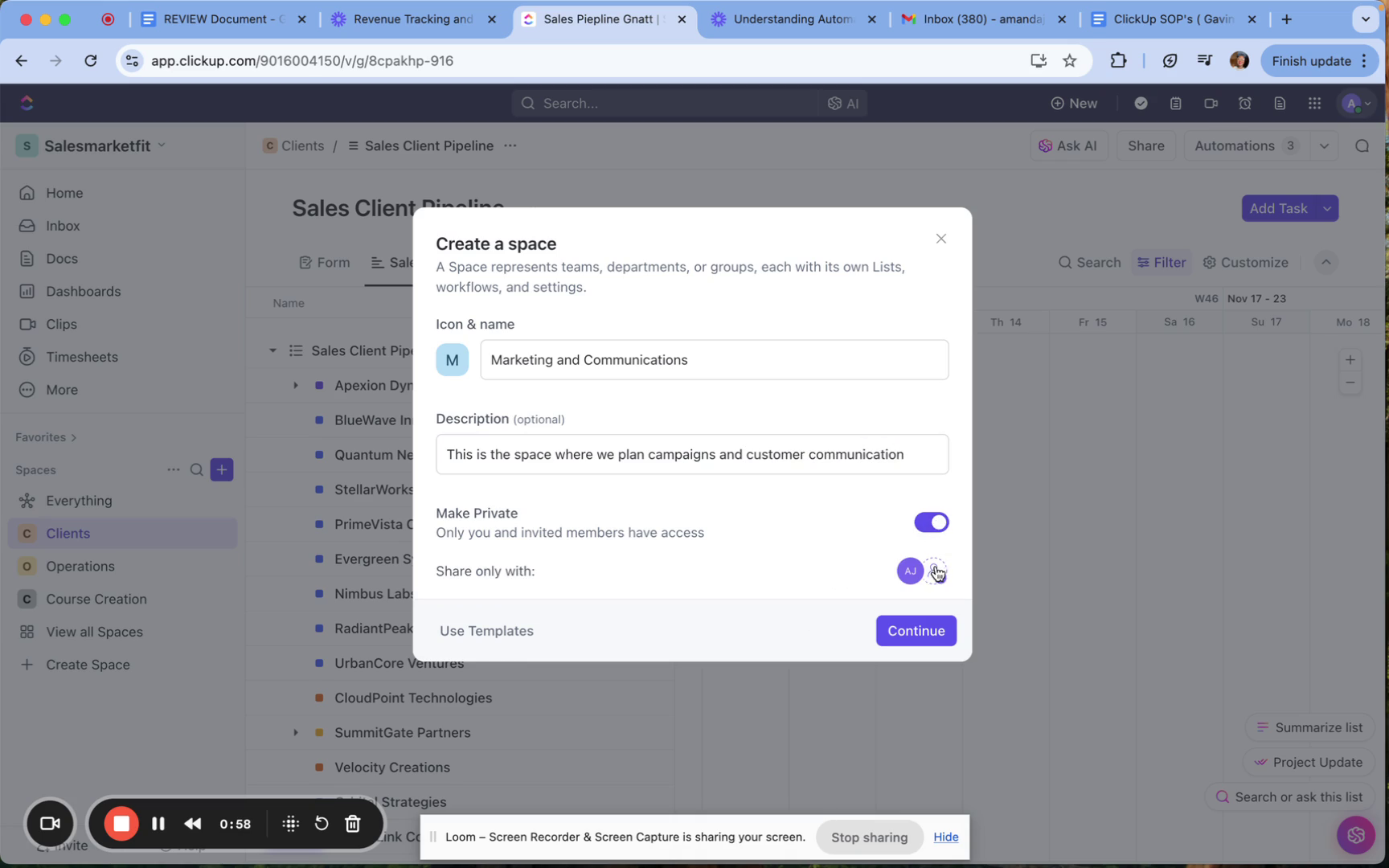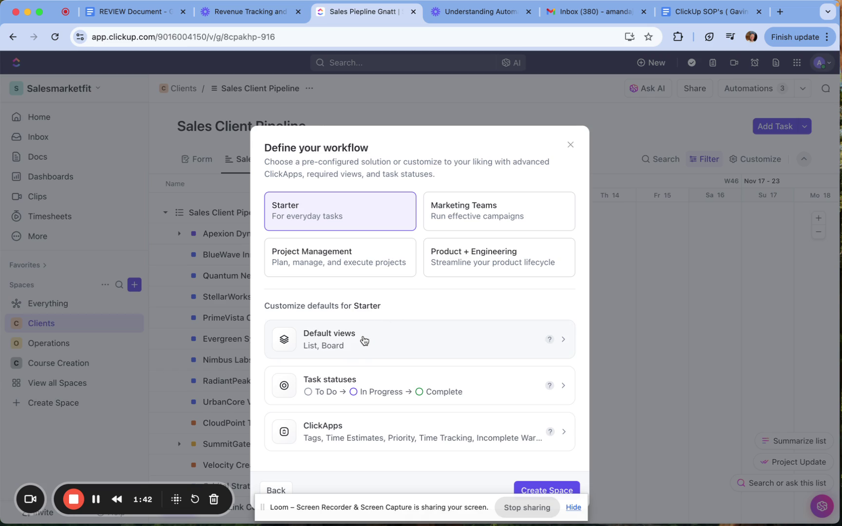 This guide has provided an overview of how to create and manage spaces in ClickUp. By following these steps and utilizing the provided screenshots, you can effectively organize your tasks and collaborate with your team, ensuring a productive workflow.