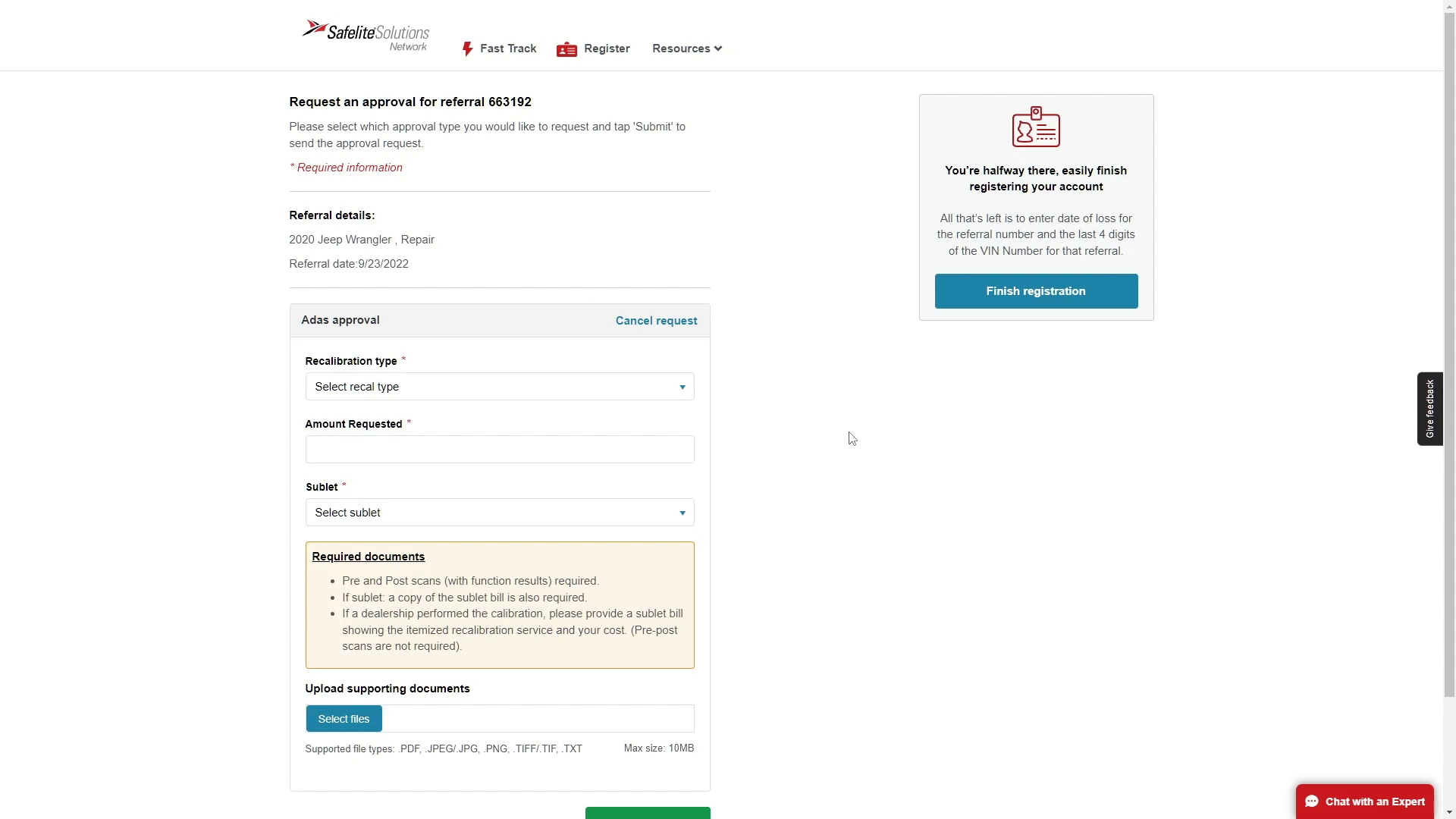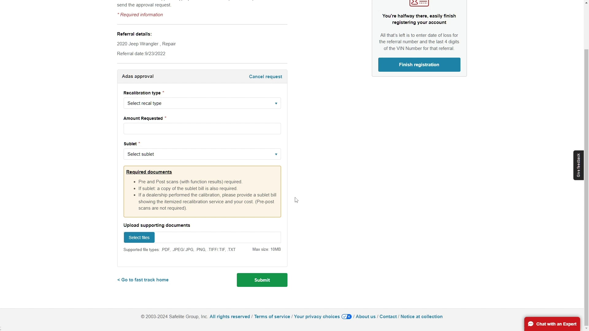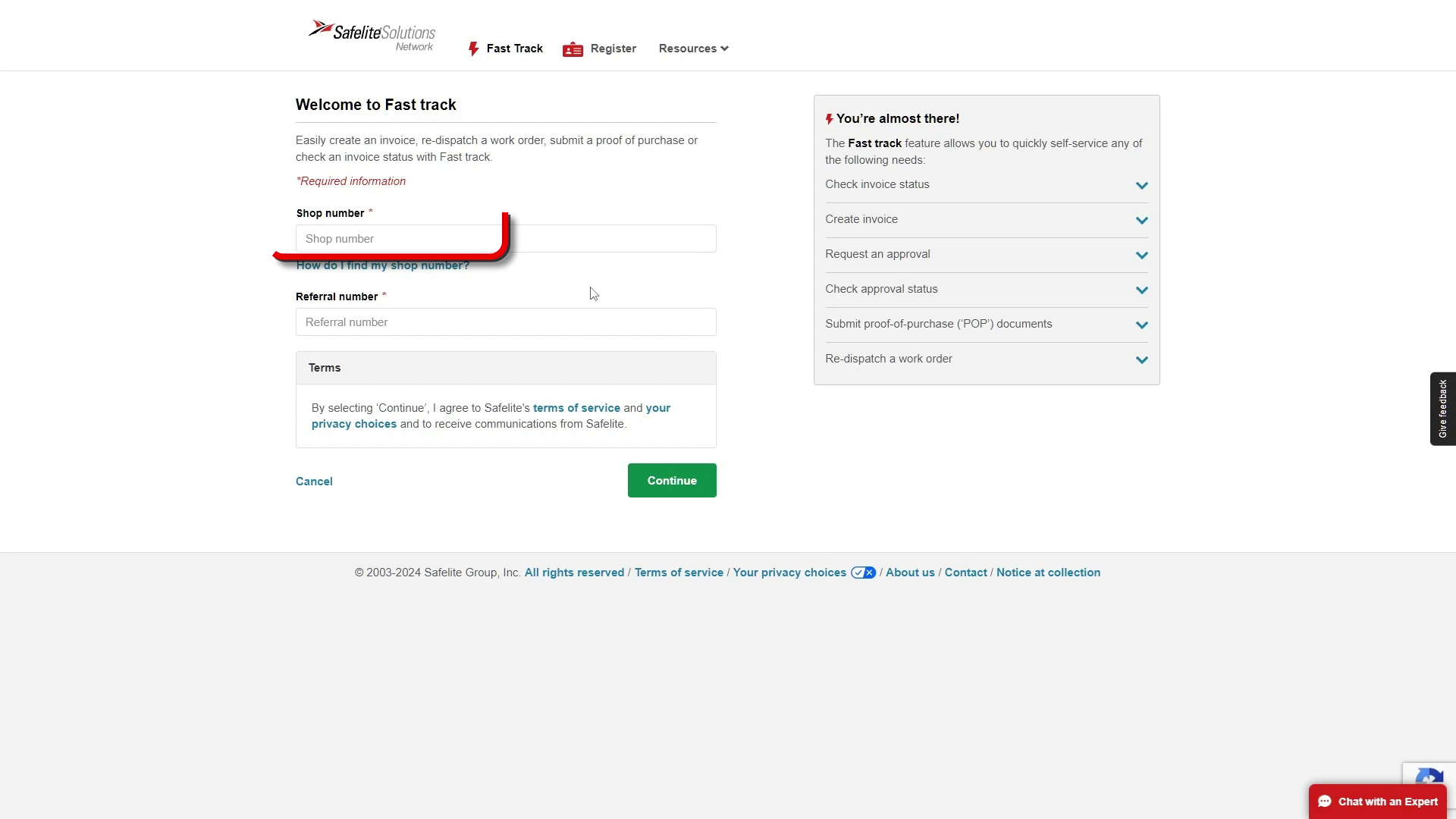 You will be redirected to the SafeLite website. Here, you need to enter your shop number and the job's referral number, both of which can be found on your dispatch.